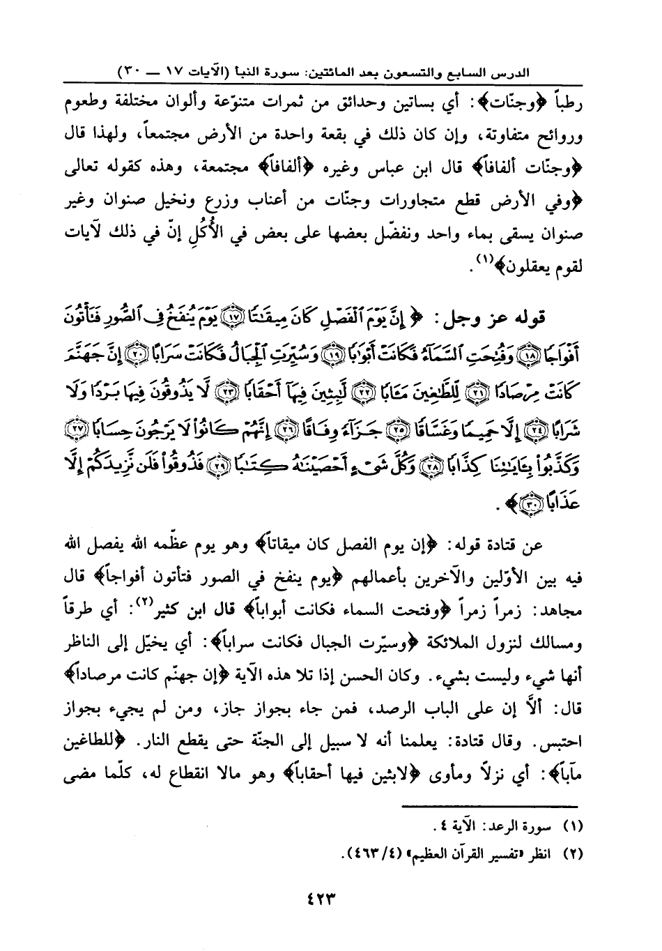 عن قتادة: قوله: {إِنَّ يَوْمَ الْفَصْلِ كَانَ مِيقَاتاً} وهو يوم عظمه الله يفصل الله فيه بين الأولين والآخرين بأعمالهم، {يَوْمَ يُنفَخُ فِي الصُّورِ فَتَأْتُونَ أَفْوَاجاً} ، قال مجاهد: زمرًا زمرًا، {وَفُتِحَتِ السَّمَاء فَكَانَتْ أَبْوَاباً} ، قال ابن كثير: أي: طرقًا ومسالك لنزول الملائكة، {وَسُيِّرَتِ الْجِبَالُ فَكَانَتْ سَرَاباً} ، أي: يخيل إلى الناظر أنها شيء وليست بشيء. وكان الحسن إذا تلا هذه الآية: {إِنَّ جَهَنَّمَ كَانَتْ مِرْصَاداً} ، قال: ألا إن على الباب الرصد، فمن جاء بجواز جاز، ومن لم يجيء بجواز احتبس. وقال قتادة: يعلمنا أنه لا سبيل إلى الجنة حتى يقطع النار. {لِلْطَّاغِينَ مَآباً} ، أي: نزلاً ومأوى، {لَابِثِينَ فِيهَا أَحْقَاباً} وهو مالا انقطاع له، كلما مضى