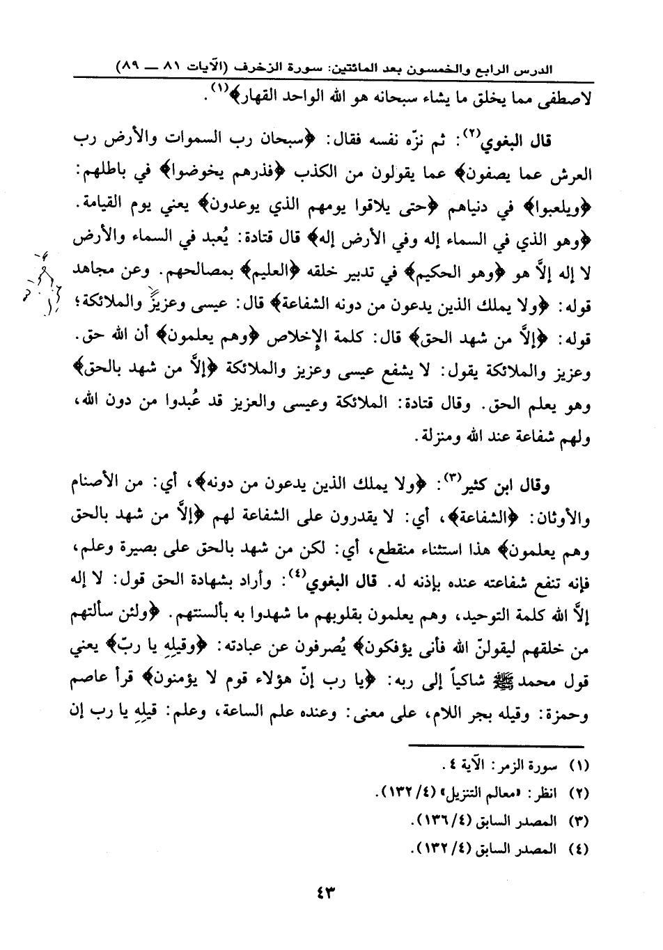 قال البغوي: ثم نزه نفسه فقال: {سُبْحَانَ رَبِّ السَّمَاوَاتِ وَالْأَرْضِ رَبِّ الْعَرْشِ عَمَّا يَصِفُونَ} عما يقولون من الكذب {فَذَرْهُمْ ... يَخُوضُوا} في باطلهم، {وَيَلْعَبُوا} في دنياهم {حَتَّى يُلَاقُوا يَوْمَهُمُ الَّذِي يُوعَدُونَ} ، يعني: يوم القيامة. {وَهُوَ الَّذِي فِي السَّمَاء إِلَهٌ وَفِي الْأَرْضِ إِلَهٌ} ، قال قتادة: يعبد في السماء والأرض لا إله إلا هو {وَهُوَ الْحَكِيمُ} في تدبير خلقه، {الْعَلِيمُ} بمصالحهم. وعن مجاهد: قوله: {وَلَا يَمْلِكُ الَّذِينَ يَدْعُونَ مِن دُونِهِ الشَّفَاعَةَ} ، قال: عيسى وعزير والملائكة. قوله: {إِلَّا مَن شَهِدَ بِالْحَقِّ} قال: كلمة الإخلاص