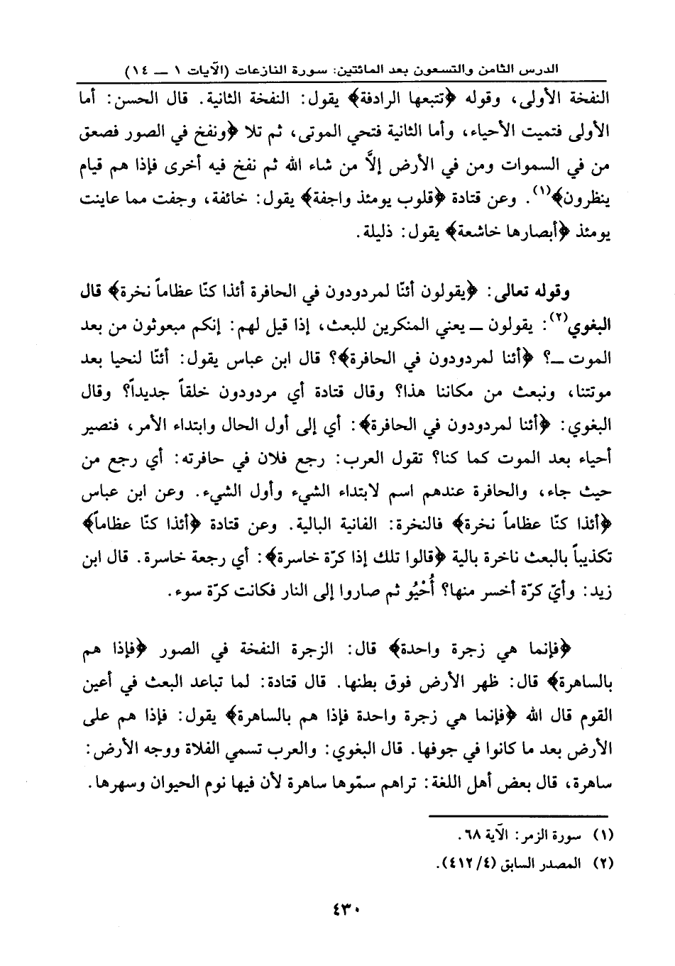 {فَإِنَّمَا هِيَ زَجْرَةٌ وَاحِدَةٌ} قال: الزجرة: النفخة في الصور {فَإِذَا هُم بِالسَّاهِرَةِ} قال: ظهر الأرض فوق بطنها. قال قتادة: لما تباعد البعث في أعين القوم قال الله: {فَإِنَّمَا هِيَ زَجْرَةٌ وَاحِدَةٌ * فَإِذَا هُم بِالسَّاهِرَةِ} يقول: فإذا هم على الأرض بعد ما كانوا في جوفها. قال البغوي: والعرب تسمي الفلاة ووجه الأرض: ساهرة، قال بعض أهل اللغة: تراهم سمّوها ساهرة لأن فيها نوم الحيوان وسهرها.