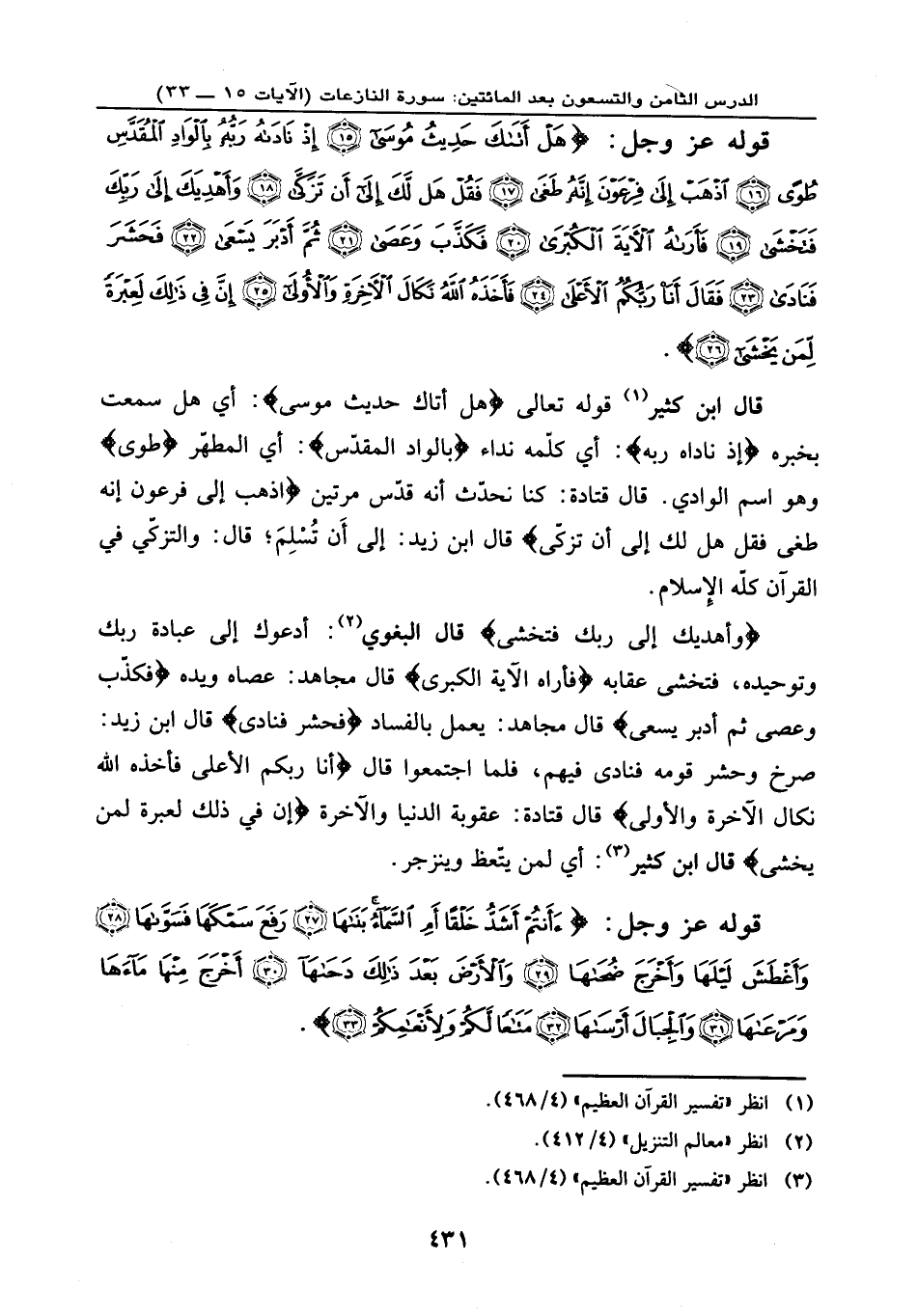 قوله عز وجل: {هَلْ أتَاكَ حَدِيثُ مُوسَى (15) إِذْ نَادَاهُ رَبُّهُ بِالْوَادِ الْمُقَدَّسِ طُوًى (16) اذْهَبْ إِلَى فِرْعَوْنَ إِنَّهُ طَغَى (17) فَقُلْ هَل لَّكَ إِلَى أَن تَزَكَّى (18) وَأَهْدِيَكَ إِلَى رَبِّكَ فَتَخْشَى (19) فَأَرَاهُ الْآيَةَ الْكُبْرَى (20) فَكَذَّبَ وَعَصَى (21) ثُمَّ أَدْبَرَ يَسْعَى (22) فَحَشَرَ فَنَادَى (23) فَقَالَ أَنَا رَبُّكُمُ الْأَعْلَى (24) فَأَخَذَهُ اللَّهُ نَكَالَ الْآخِرَةِ وَالْأُولَى (25) إِنَّ فِي ذَلِكَ لَعِبْرَةً لِّمَن يَخْشَى (26) } .