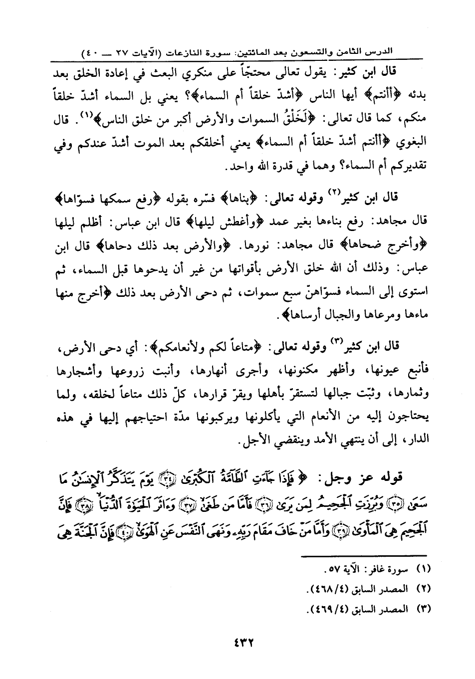 قال ابن كثير: وقوله تعالى: {مَتَاعاً لَّكُمْ وَلِأَنْعَامِكُمْ} ، أي: دحى الأرض، فأنبع عيونها، وأظهر مكنونها، وأخرج أنهارها، وأنبت زروعها وأشجارها وثمارها، وثبّت جبالها لتستقرّ بأهلها ويقرّ قرارها، كلّ ذلك متاعاً لخلقه، ولما يحتاجون إليه من الأنعام التي يأكلونها ويركبونها مدّة احتياجهم إليها في هذه الدار إلى أن ينتهي الأمد وينقضي الأجل.