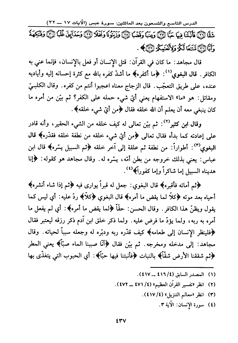 {ثُمَّ أَمَاتَهُ فَأَقْبَرَهُ} ، قال البغوي: جعل له قبرًا يوارى فيه {ثُمَّ إِذَا شَاء أَنشَرَهُ} أحياه بعد موته، {كَلَّا لَمَّا يَقْضِ مَا أَمَرَهُ} ، قال البغوي {كَلَّا} رد عليه، أي: ليس كما يقول ويظن هذا الكافر. وقال الحسن: حقًا، {لَمَّا يَقْضِ مَا أَمَرَهُ} ، أي: لم يفعل ما أمره الله به ربه، ولما يؤد ما فرض عليه. ولما ذكر خلق ابن آدم ذكر رزقه ليعتبر فقال: {فَلْيَنظُرِ الْإِنسَانُ إِلَى طَعَامِهِ} كيف قدره ربه ودبره له وجعله سببًا لحياته. وقال مجاهد: إلى مدخله ومخرجه. ثم بين فقال: {أَنَّا صَبَبْنَا الْمَاء صَبّاً} ، يعني: المطر، {ثُمَّ شَقَقْنَا الْأَرْضَ شَقّاً} بالنبات {فَأَنبَتْنَا فِيهَا حَبّاً} ، أي: الحبوب التي يتغذى بها