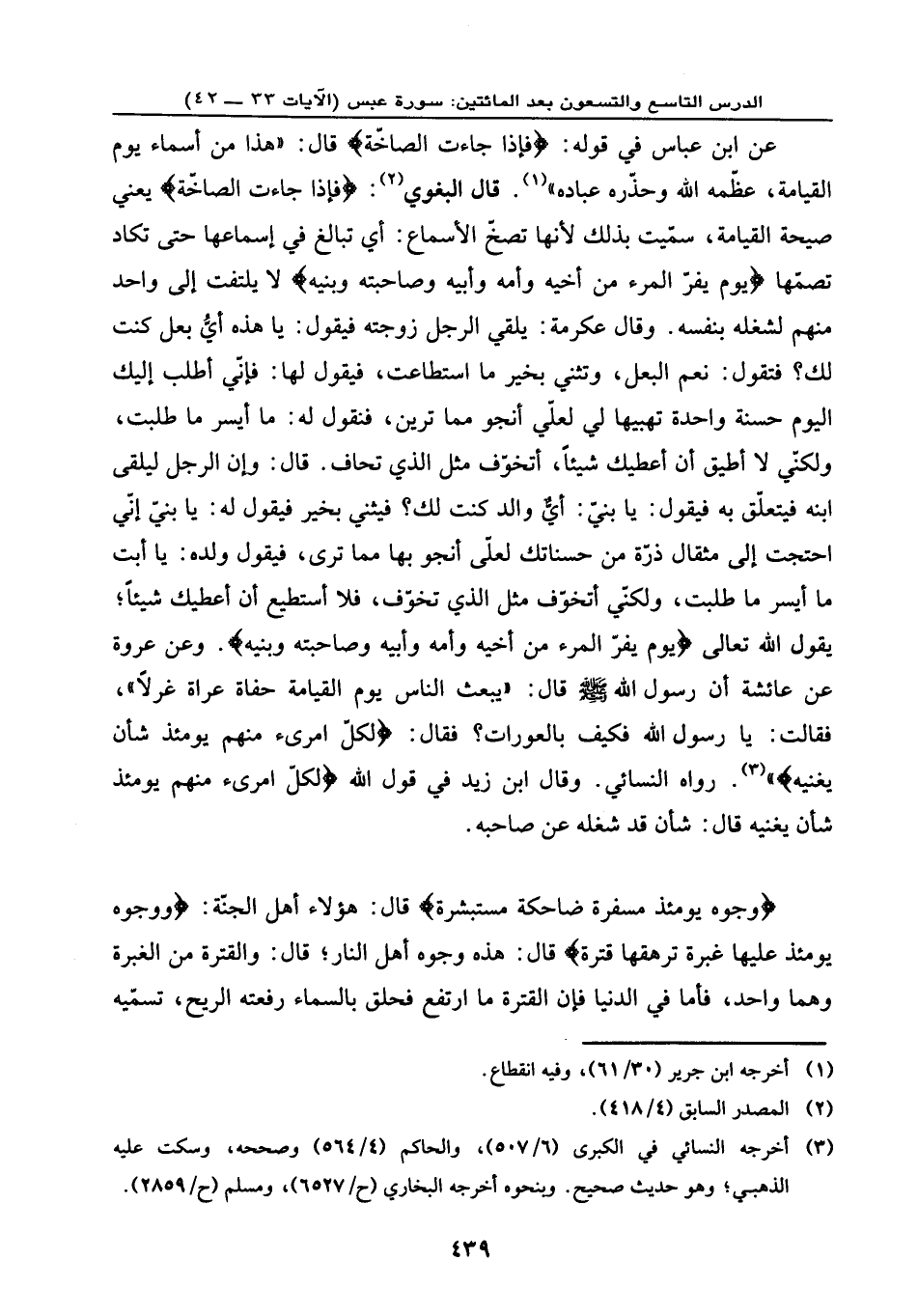 عن ابن عباس في قوله: {فَإِذَا جَاءتِ الصَّاخَّةُ} ، قال: (هذا من أسماء يوم القيامة، عظمه الله وحذره عباده) . قال البغوي: {فَإِذَا جَاءتِ الصَّاخَّةُ} ، يعني: صيحة القيامة، سميت بذلك لأنها تصخ الأسماع: أي: تبالغ في إسماعها حتى تكاد تصمها، {يَوْمَ يَفِرُّ الْمَرْءُ مِنْ أَخِيهِ * وَأُمِّهِ وَأَبِيهِ * وَصَاحِبَتِهِ وَبَنِيهِ} لا يلتفت إلى واحد منهم لشغله بنفسه. وقال عكرمة: يلقى الرجل زوجته فيقول: يا هذه أيّ بعل كنت لك؟ فتقول: نعم البعل، وتثني بخير ما استطاعت، فيقول لها: