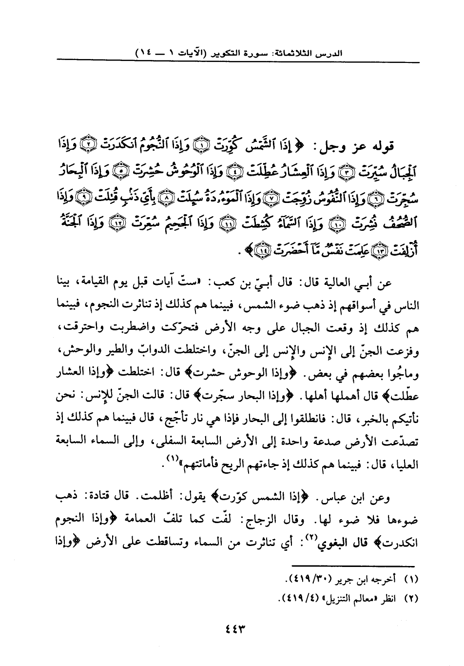 قوله عز وجل: {إِذَا الشَّمْسُ كُوِّرَتْ (1) وَإِذَا النُّجُومُ انكَدَرَتْ (2) وَإِذَا الْجِبَالُ سُيِّرَتْ (3) وَإِذَا الْعِشَارُ عُطِّلَتْ (4) وَإِذَا الْوُحُوشُ حُشِرَتْ (5) وَإِذَا الْبِحَارُ سُجِّرَتْ (6) وَإِذَا النُّفُوسُ زُوِّجَتْ (7) وَإِذَا الْمَوْؤُودَةُ سُئِلَتْ (8) بِأَيِّ ذَنبٍ قُتِلَتْ (9) وَإِذَا الصُّحُفُ نُشِرَتْ (10) وَإِذَا السَّمَاء كُشِطَتْ (11) وَإِذَا الْجَحِيمُ سُعِّرَتْ (12) وَإِذَا الْجَنَّةُ أُزْلِفَتْ (13) عَلِمَتْ نَفْسٌ مَّا أَحْضَرَتْ (14) } .