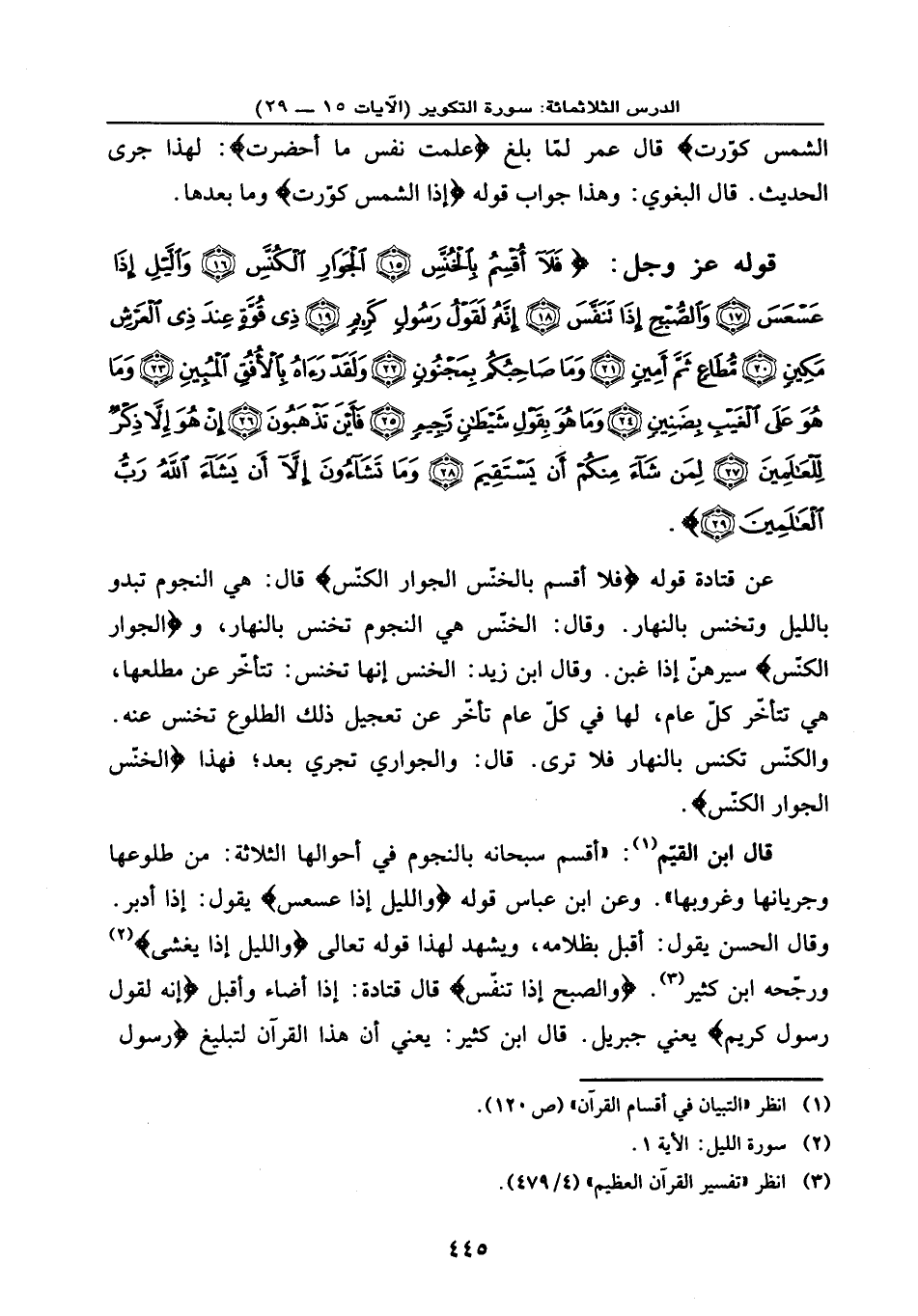وقال ابن القيم: (أقسم سبحانه بالنجوم في أحوالها الثلاثة: من طلوعها وجريانها وغروبها) . وعن ابن عباس قوله: {وَاللَّيْلِ إِذَا عَسْعَسَ} ، يقول: إذا أدبر. وقال الحسن يقول: أقبل بظلامه، ويشهد لهذا قوله تعالى: {وَاللَّيْلِ إِذَا يَغْشَى} ورجحه ابن كثير. {وَالصُّبْحِ إِذَا تَنَفَّسَ} ، قال قتادة: إذا أضاء وأقبل، {إِنَّهُ لَقَوْلُ رَسُولٍ كَرِيمٍ} ، يعني: جبريل. قال ابن كثير: يعني أن هذا القرآن لتبليغ {رَسُولٍ