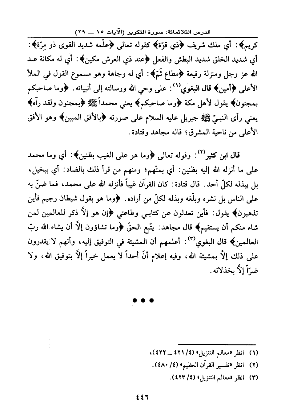 كَرِيمٍ} ، أي: ملك شريف، {ذِي قُوَّةٍ} كقوله تعالى: {عَلَّمَهُ شَدِيدُ الْقُوَى ذُو مِرَّةٍ} ، أي: شديد الخلق شديد البطش والفعل، {عِندَ ذِي الْعَرْشِ مَكِينٍ} ، أي: له مكانة عند الله عز وجل ومنزلة رفيعة، {مُطَاعٍ ثَمَّ} ، أي: له وجاهة وهو مسموع القول في الملأ الأعلى، {أَمِينٍ} ، قال البغوي: على وحي الله ورسالته إلى أنبيائه. {وَمَا صَاحِبُكُم بِمَجْنُونٍ} ، يقول لأهل مكة: {وَمَا صَاحِبُكُم} ، يعني: محمدًا - صلى الله عليه وسلم -، {بِمَجْنُونٍ وَلَقَدْ رَآهُ} ، يعني: رأى النبي - صلى الله عليه وسلم - جبريل عليه السلام على صورته {بِالْأُفُقِ الْمُبِينِ} وهو الأفق الأعلى من ناحية المشرق؛ قاله مجاهد، وقتادة.