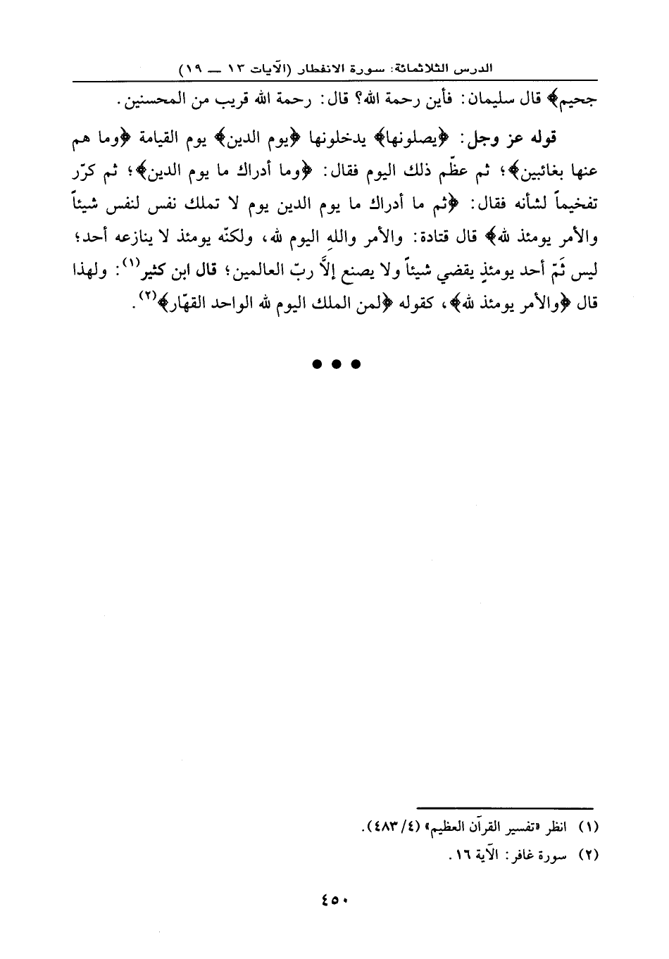 قوله عز وجل: {يَصْلَوْنَهَا} يدخلونها {يَوْمَ الدِّينِ} يوم القيامة {وَمَا هُمْ عَنْهَا بِغَائِبِينَ} ؛ ثم عظم ذلك اليوم فقال: {وَمَا أَدْرَاكَ مَا يَوْمُ الدِّينِ} ؛ ثم كرر تفخيمًا لشأنه فقال: {ثُمَّ مَا أَدْرَاكَ مَا يَوْمُ الدِّينِ * يَوْمَ لَا تَمْلِكُ نَفْسٌ لِّنَفْسٍ شَيْئاً وَالْأَمْرُ يَوْمَئِذٍ لِلَّهِ} ، قال قتادة: والأمر والله اليوم لله، لكنه يومئذٍ لا ينازعه أحد؛ ليس ثم أحد يومئذٍ يقضي شيئًا ولا يصنع إلا رب العالمين؛ قال ابن كثير: ولهذا قال: {وَالْأَمْرُ يَوْمَئِذٍ لِلَّهِ} ، كقوله: {لِّمَنِ الْمُلْكُ الْيَوْمَ لِلَّهِ الْوَاحِدِ الْقَهَّارِ} .