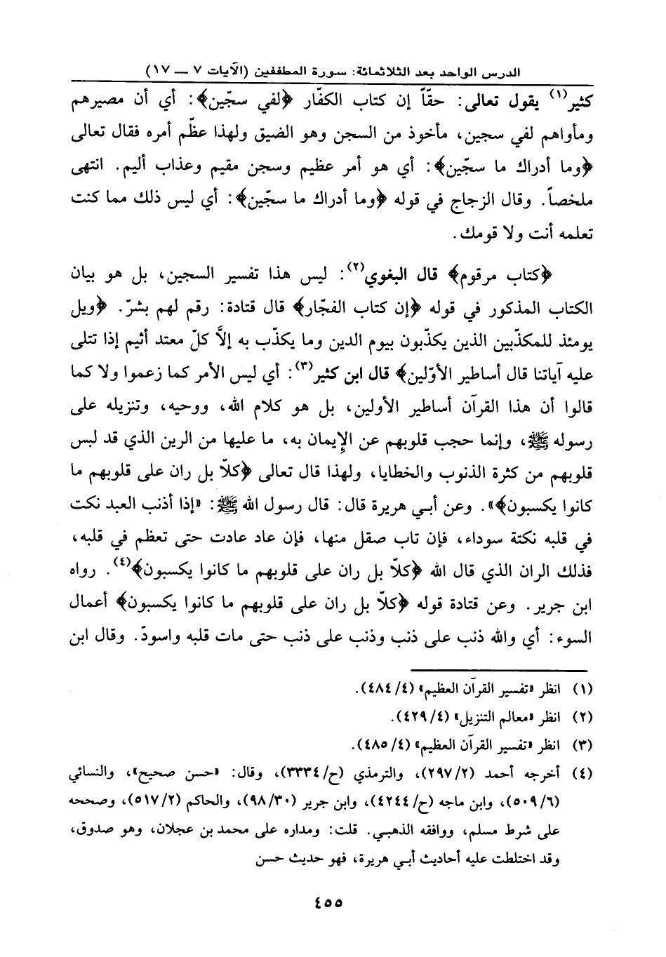 {كِتَابٌ مَّرْقُومٌ} ، قال البغوي: ليس هذا تفسير السجين، بل هو بيان الكتاب المذكور في قوله: {إِنَّ كِتَابَ الفُجَّارِ} ، قال قتادة: رقم لهم بشرّ. {وَيْلٌ يَوْمَئِذٍ لِّلْمُكَذِّبِينَ * الَّذِينَ يُكَذِّبُونَ بِيَوْمِ الدِّينِ * وَمَا يُكَذِّبُ بِهِ إِلَّا كُلُّ مُعْتَدٍ أَثِيمٍ * إِذَا تُتْلَى عَلَيْهِ آيَاتُنَا قَالَ أَسَاطِيرُ الْأَوَّلِينَ} ، قال ابن كثير: أي: ليس الأمر كما زعموا ولا كما قالوا إن هذا القرآن أساطير الأولين، بل هو كلام الله ووحيه، وتنزيله على رسوله - صلى الله عليه وسلم - وإنما حجب قلوبهم عن الإيمان به ما عليها من الرين الذي قد لبس قلوبهم من كثرة الذنوب والخطايا، ولهذا قال تعالى: {كَلَّا بَلْ رَانَ عَلَى قُلُوبِهِم مَّا كَانُوا يَكْسِبُونَ} ، وعن أبي هريرة قال: قال رسول الله - صلى الله عليه وسلم -: «إذا أذنب العبد نكت في قلبه نكتة سوداء، فإن تاب صقل منها، فإن عاد عادت حتى تعظم في قلبه فذلك الران الذي قال الله: {كَلَّا بَلْ رَانَ عَلَى قُلُوبِهِم مَّا كَانُوا يَكْسِبُونَ} . رواه ابن جرير. وعن قتادة: قوله: ... {كَلَّا بَلْ رَانَ عَلَى قُلُوبِهِم مَّا كَانُوا يَكْسِبُونَ} أعمال السوء: أي والله ذنب على ذنب وذنب على ذنب حتى مات قلبه واسود. وقال ابن