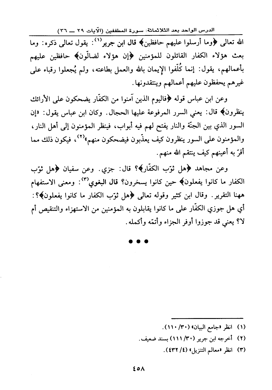 وعن مجاهد: {هَلْ ثُوِّبَ الْكُفَّارُ} ، قال: جزي. وعن سفيان: {هَلْ ثُوِّبَ الْكُفَّارُ مَا كَانُوا يَفْعَلُونَ} ، حين كانوا يسخرون؟ قال البغوي: ومعنى الاستفهام ها هنا: التقرير. وقال ابن كثير: وقوله تعالى: {هَلْ ثُوِّبَ الْكُفَّارُ مَا كَانُوا يَفْعَلُونَ} ؟ أي: هل جوزي