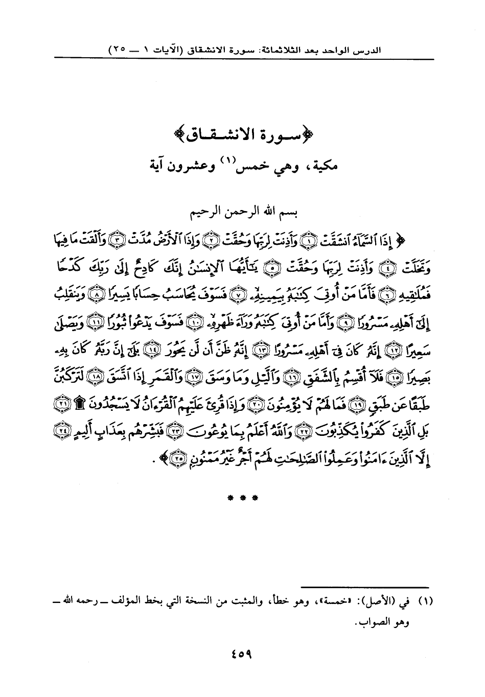 ... {إِذَا السَّمَاء انشَقَّتْ (1) وَأَذِنَتْ لِرَبِّهَا وَحُقَّتْ (2) وَإِذَا الْأَرْضُ مُدَّتْ (3) وَأَلْقَتْ مَا فِيهَا وَتَخَلَّتْ (4) وَأَذِنَتْ لِرَبِّهَا وَحُقَّتْ (5) يَا أَيُّهَا الْإِنسَانُ إِنَّكَ كَادِحٌ إِلَى رَبِّكَ كَدْحاً فَمُلَاقِيهِ (6) فَأَمَّا مَنْ أُوتِيَ كِتَابَهُ بِيَمِينِهِ (7) فَسَوْفَ يُحَاسَبُ حِسَاباً يَسِيراً (8) وَيَنقَلِبُ إِلَى أَهْلِهِ مَسْرُوراً (9) وَأَمَّا مَنْ أُوتِيَ كِتَابَهُ وَرَاء ظَهْرِهِ (10) فَسَوْفَ يَدْعُو ثُبُوراً (11) وَيَصْلَى سَعِيراً (12) إِنَّهُ كَانَ فِي أَهْلِهِ مَسْرُوراً (13) إِنَّهُ ظَنَّ أَن لَّن يَحُورَ (14) بَلَى إِنَّ رَبَّهُ كَانَ بِهِ بَصِيراً (15) فَلَا أُقْسِمُ بِالشَّفَقِ (16) وَاللَّيْلِ وَمَا وَسَقَ (17) وَالْقَمَرِ إِذَا اتَّسَقَ (18) لَتَرْكَبُنَّ طَبَقاً عَن طَبَقٍ (19) فَمَا لَهُمْ لَا يُؤْمِنُونَ (20) وَإِذَا قُرِئَ عَلَيْهِمُ الْقُرْآنُ لَا يَسْجُدُونَ (21) بَلِ الَّذِينَ كَفَرُواْ يُكَذِّبُونَ (22) وَاللَّهُ أَعْلَمُ بِمَا يُوعُونَ (23) فَبَشِّرْهُم بِعَذَابٍ أَلِيمٍ (24) إِلَّا الَّذِينَ آمَنُواْ وَعَمِلُواْ الصَّالِحَاتِ لَهُمْ أَجْرٌ غَيْرُ مَمْنُونٍ (25) } .