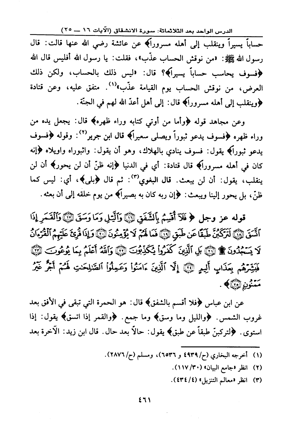 قوله عز وجل: {فَلَا أُقْسِمُ بِالشَّفَقِ (16) وَاللَّيْلِ وَمَا وَسَقَ (17) وَالْقَمَرِ إِذَا اتَّسَقَ (18) لَتَرْكَبُنَّ طَبَقاً عَن طَبَقٍ (19) فَمَا لَهُمْ لَا يُؤْمِنُونَ (20) وَإِذَا قُرِئَ عَلَيْهِمُ الْقُرْآنُ لَا يَسْجُدُونَ (21) بَلِ الَّذِينَ كَفَرُواْ يُكَذِّبُونَ (22) وَاللَّهُ أَعْلَمُ بِمَا يُوعُونَ (23) فَبَشِّرْهُم بِعَذَابٍ