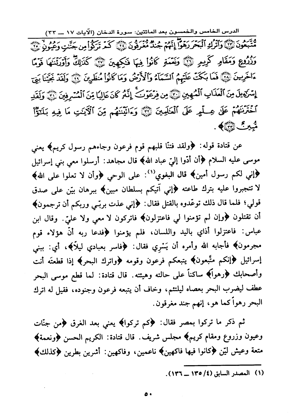 مُّتَّبَعُونَ (23) وَاتْرُكْ الْبَحْرَ رَهْواً إِنَّهُمْ جُندٌ مُّغْرَقُونَ (24) كَمْ تَرَكُوا مِن جَنَّاتٍ وَعُيُونٍ (25) وَزُرُوعٍ وَمَقَامٍ كَرِيمٍ (26) وَنَعْمَةٍ كَانُوا فِيهَا فَاكِهِينَ (27) كَذَلِكَ وَأَوْرَثْنَاهَا قَوْماً آخَرِينَ (28) فَمَا بَكَتْ عَلَيْهِمُ السَّمَاء وَالْأَرْضُ وَمَا كَانُوا مُنظَرِينَ (29) وَلَقَدْ نَجَّيْنَا بَنِي إِسْرَائِيلَ مِنَ الْعَذَابِ الْمُهِينِ (30) مِن فِرْعَوْنَ إِنَّهُ كَانَ عَالِياً مِّنَ الْمُسْرِفِينَ (31) وَلَقَدِ اخْتَرْنَاهُمْ عَلَى عِلْمٍ عَلَى الْعَالَمِينَ (32) وَآتَيْنَاهُم مِّنَ الْآيَاتِ مَا فِيهِ بَلَاء مُّبِينٌ (33) } .