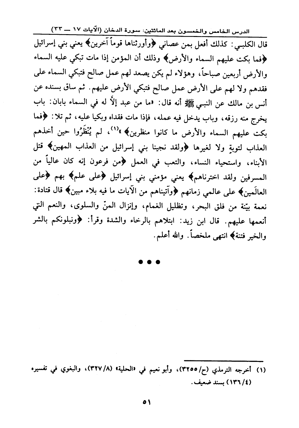 قال الكلبي: كذلك أفعل بمن عصاني {وَأَوْرَثْنَاهَا قَوْماً آخَرِينَ} يعني: بني إسرائيل {فَمَا بَكَتْ عَلَيْهِمُ السَّمَاء وَالْأَرْضُ} وذلك أن المؤمن إذا مات تبكي عليه السماء والأرض أربعين صباحًا وهؤلاء لم يكن يصعد لهم عمل صالح فتبكي السماء على فقدهم ولا لهم على الأرض عمل صالح فتبكي الأرض عليهم. ثم ساق بسنده عن أنس بن مالك عن النبي - صلى الله عليه وسلم - أنه قال: «ما من عبد إلا له في السماء بابان: باب يخرج منه رزقه، وباب يدخل فيه عمله، فإذا مات فقداه وبكيا عليه، - ثم تلا -: {فَمَا بَكَتْ عَلَيْهِمُ السَّمَاء وَالْأَرْضُ وَمَا كَانُوا مُنظَرِينَ} » لم ينظروا حين أخذهم