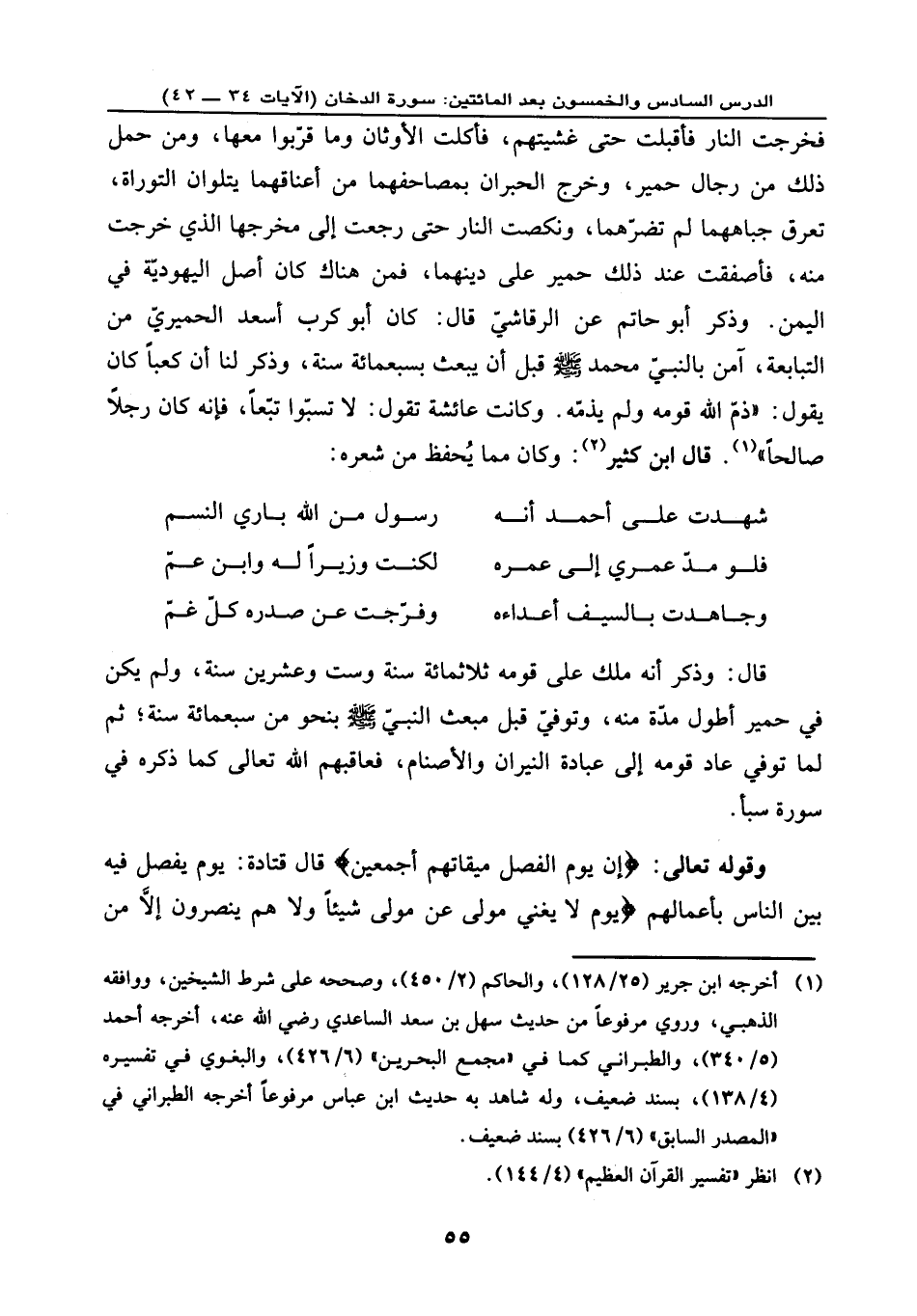 فخرجت النار فأقبلت حتى غشيتهم، فأكلت الأوثان وما قربوا معها، ومن حمل ذلك من رجال حمير، وخرج الحبران بمصاحفهما من أعناقهما يتلوان التوراة، تعرق جباههما لم تضرهما، ونكصت النار حتى رجعت إلى مخرجها، الذي خرجت منه، فأصفقت عند ذلك حمير على دينهما، فمن هنالك كان أصل اليهودية في اليمن. وذكر أبو حاتم عن الرقاشي قال: كان أبو كرب أسعد الحميري من التبابعة، آمن بالنبي محمد - صلى الله عليه وسلم - قبل أن يبعث بسبعمائة سنة، وذكر لنا أن كعبًا كان يقول: ذم الله قومه ولم يذمه وكانت عائشة تقول: لا تسبوا تبعًا، فإنه كان رجلاً صالحًا. وقال ابن كثير: وكان مما يحفظ من شعره: