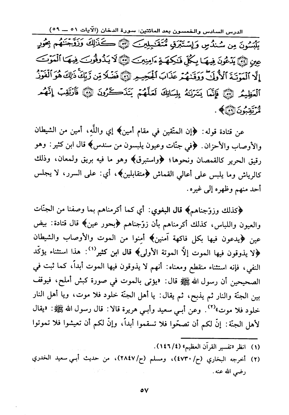 يَلْبَسُونَ مِن سُندُسٍ وَإِسْتَبْرَقٍ مُّتَقَابِلِينَ (53) كَذَلِكَ وَزَوَّجْنَاهُم بِحُورٍ عِينٍ (54) يَدْعُونَ فِيهَا بِكُلِّ فَاكِهَةٍ آمِنِينَ (55) لَا يَذُوقُونَ فِيهَا الْمَوْتَ إِلَّا الْمَوْتَةَ الْأُولَى وَوَقَاهُمْ عَذَابَ الْجَحِيمِ (56) فَضْلاً مِّن رَّبِّكَ ذَلِكَ هُوَ الْفَوْزُ الْعَظِيمُ (57) فَإِنَّمَا يَسَّرْنَاهُ بِلِسَانِكَ لَعَلَّهُمْ يَتَذَكَّرُونَ (58) فَارْتَقِبْ إِنَّهُم مُّرْتَقِبُونَ (59) } .