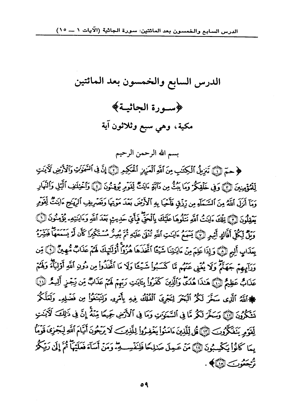 {حم (1) تَنزِيلُ الْكِتَابِ مِنَ اللَّهِ الْعَزِيزِ الْحَكِيمِ (2) إِنَّ فِي السَّمَاوَاتِ وَالْأَرْضِ لَآيَاتٍ لِّلْمُؤْمِنِينَ (3) وَفِي خَلْقِكُمْ وَمَا يَبُثُّ مِن دَابَّةٍ آيَاتٌ لِّقَوْمٍ يُوقِنُونَ (4) وَاخْتِلَافِ اللَّيْلِ وَالنَّهَارِ وَمَا أَنزَلَ اللَّهُ مِنَ السَّمَاءِ مِن رِّزْقٍ فَأَحْيَا بِهِ الْأَرْضَ بَعْدَ مَوْتِهَا وَتَصْرِيفِ الرِّيَاحِ آيَاتٌ لِّقَوْمٍ يَعْقِلُونَ (5) تِلْكَ آيَاتُ اللَّهِ نَتْلُوهَا عَلَيْكَ بِالْحَقِّ فَبِأَيِّ حَدِيثٍ بَعْدَ اللَّهِ وَآيَاتِهِ يُؤْمِنُونَ (6) وَيْلٌ لِّكُلِّ أَفَّاكٍ أَثِيمٍ (7) يَسْمَعُ آيَاتِ اللَّهِ تُتْلَى عَلَيْهِ ثُمَّ يُصِرُّ مُسْتَكْبِراً كَأَن لَّمْ يَسْمَعْهَا فَبَشِّرْهُ بِعَذَابٍ أَلِيمٍ (8) وَإِذَا عَلِمَ مِنْ آيَاتِنَا شَيْئاً اتَّخَذَهَا هُزُواً أُوْلَئِكَ لَهُمْ عَذَابٌ مُّهِينٌ (9) مِن وَرَائِهِمْ جَهَنَّمُ وَلَا يُغْنِي عَنْهُم مَّا كَسَبُوا شَيْئاً وَلَا مَا اتَّخَذُوا مِن دُونِ اللَّهِ أَوْلِيَاء وَلَهُمْ عَذَابٌ عَظِيمٌ (10) هَذَا هُدًى وَالَّذِينَ كَفَرُوا بِآيَاتِ رَبِّهِمْ لَهُمْ عَذَابٌ مَّن رِّجْزٍ أَلِيمٌ (11) اللَّهُ الَّذِي سخَّرَ لَكُمُ الْبَحْرَ لِتَجْرِيَ الْفُلْكُ فِيهِ بِأَمْرِهِ وَلِتَبْتَغُوا مِن فَضْلِهِ وَلَعَلَّكُمْ تَشْكُرُونَ (12) وَسَخَّرَ لَكُم مَّا فِي السَّمَاوَاتِ وَمَا فِي الْأَرْضِ جَمِيعاً مِّنْهُ إِنَّ فِي ذَلِكَ لَآيَاتٍ لَّقَوْمٍ يَتَفَكَّرُونَ (13) قُل لِّلَّذِينَ آمَنُوا يَغْفِرُوا لِلَّذِينَ لا يَرْجُون أَيَّامَ اللَّهِ لِيَجْزِيَ قَوْماً بِما كَانُوا يَكْسِبُونَ (14) مَنْ عَمِلَ صَالِحاً فَلِنَفْسِهِ وَمَنْ أَسَاء فَعَلَيْهَا ثُمَّ إِلَى رَبِّكُمْ تُرْجَعُونَ (15) } .