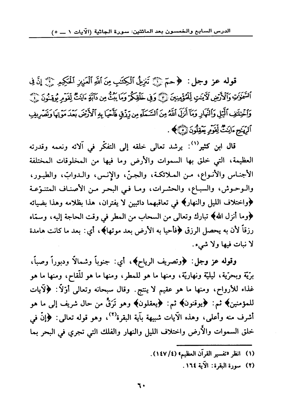 قوله عز وجل: {حم (1) تَنزِيلُ الْكِتَابِ مِنَ اللَّهِ الْعَزِيزِ الْحَكِيمِ (2) إِنَّ فِي السَّمَاوَاتِ وَالْأَرْضِ لَآيَاتٍ لِّلْمُؤْمِنِينَ (3) وَفِي خَلْقِكُمْ وَمَا يَبُثُّ مِن دَابَّةٍ آيَاتٌ لِّقَوْمٍ يُوقِنُونَ (4) وَاخْتِلَافِ اللَّيْلِ وَالنَّهَارِ وَمَا أَنزَلَ اللَّهُ مِنَ السَّمَاءِ مِن رِّزْقٍ فَأَحْيَا بِهِ الْأَرْضَ بَعْدَ مَوْتِهَا وَتَصْرِيفِ الرِّيَاحِ آيَاتٌ لِّقَوْمٍ يَعْقِلُونَ (5) } .