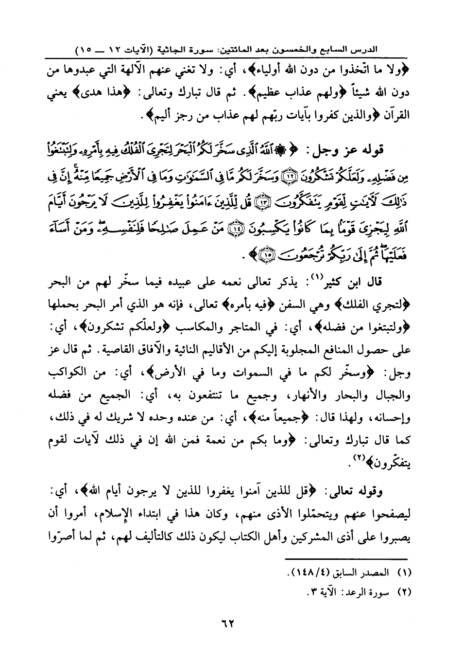 قوله عز وجل: {اللَّهُ الَّذِي سخَّرَ لَكُمُ الْبَحْرَ لِتَجْرِيَ الْفُلْكُ فِيهِ بِأَمْرِهِ وَلِتَبْتَغُوا مِن فَضْلِهِ وَلَعَلَّكُمْ تَشْكُرُونَ (12) وَسَخَّرَ لَكُم مَّا فِي السَّمَاوَاتِ وَمَا فِي الْأَرْضِ جَمِيعاً مِّنْهُ إِنَّ فِي ذَلِكَ لَآيَاتٍ لَّقَوْمٍ يَتَفَكَّرُونَ (13) قُل لِّلَّذِينَ آمَنُوا يَغْفِرُوا لِلَّذِينَ لا يَرْجُون أَيَّامَ اللَّهِ لِيَجْزِيَ قَوْماً بِما كَانُوا يَكْسِبُونَ (14) مَنْ عَمِلَ صَالِحاً فَلِنَفْسِهِ وَمَنْ أَسَاء فَعَلَيْهَا ثُمَّ إِلَى رَبِّكُمْ تُرْجَعُونَ (15) } .