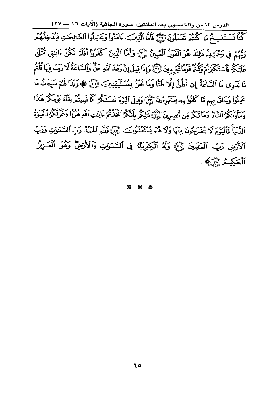 كُنَّا نَسْتَنسِخُ مَا كُنتُمْ تَعْمَلُونَ (29) فَأَمَّا الَّذِينَ آمَنُوا وَعَمِلُوا الصَّالِحَاتِ فَيُدْخِلُهُمْ رَبُّهُمْ فِي رَحْمَتِهِ ذَلِكَ هُوَ الْفَوْزُ الْمُبِينُ (30) وَأَمَّا الَّذِينَ كَفَرُوا أَفَلَمْ تَكُنْ آيَاتِي تُتْلَى عَلَيْكُمْ فَاسْتَكْبَرْتُمْ وَكُنتُمْ قَوْماً مُّجْرِمِينَ (31) وَإِذَا قِيلَ إِنَّ وَعْدَ اللَّهِ حَقٌّ وَالسَّاعَةُ لَا رَيْبَ فِيهَا قُلْتُم مَّا نَدْرِي مَا السَّاعَةُ إِن نَّظُنُّ إِلَّا ظَنّاً وَمَا نَحْنُ بِمُسْتَيْقِنِينَ (32) وَبَدَا لَهُمْ سَيِّئَاتُ مَا عَمِلُوا وَحَاقَ بِهِم مَّا كَانُوا بِهِ يَسْتَهْزِئُون (33) وَقِيلَ الْيَوْمَ نَنسَاكُمْ كَمَا نَسِيتُمْ لِقَاء يَوْمِكُمْ هَذَا وَمَأْوَاكُمْ النَّارُ وَمَا لَكُم مِّن نَّاصِرِينَ (34) ذَلِكُم بِأَنَّكُمُ اتَّخَذْتُمْ آيَاتِ اللَّهِ هُزُواً وَغَرَّتْكُمُ الْحَيَاةُ الدُّنْيَا فَالْيَوْمَ لَا يُخْرَجُونَ مِنْهَا وَلَا هُمْ يُسْتَعْتَبُونَ (35) فَلِلَّهِ الْحَمْدُ رَبِّ السَّمَاوَاتِ وَرَبِّ الْأَرْضِ رَبِّ الْعَالَمِينَ (36) وَلَهُ الْكِبْرِيَاء فِي السَّمَاوَاتِ وَالْأَرْضِ وَهُوَ الْعَزِيزُ الْحَكِيمُ (37) } .