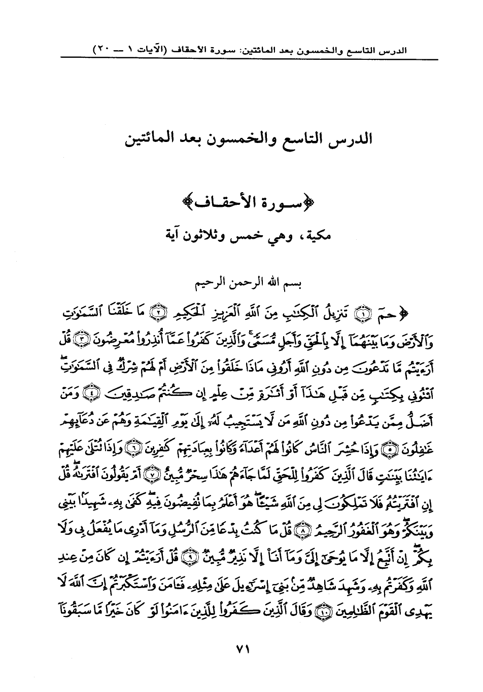{حم (1) تَنْزِيلُ الْكِتَابِ مِنَ اللَّهِ الْعَزِيزِ الْحَكِيمِ (2) مَا خَلَقْنَا السَّمَاوَاتِ وَالْأَرْضَ وَمَا بَيْنَهُمَا إِلَّا بِالْحَقِّ وَأَجَلٍ مُّسَمًّى وَالَّذِينَ كَفَرُوا عَمَّا أُنذِرُوا مُعْرِضُونَ (3) قُلْ أَرَأَيْتُم مَّا تَدْعُونَ مِن دُونِ اللَّهِ أَرُونِي مَاذَا خَلَقُوا مِنَ الْأَرْضِ أَمْ لَهُمْ شِرْكٌ فِي السَّمَاوَاتِ اِئْتُونِي بِكِتَابٍ مِّن قَبْلِ هَذَا أَوْ أَثَارَةٍ مِّنْ عِلْمٍ إِن كُنتُمْ صَادِقِينَ (4) وَمَنْ أَضَلُّ مِمَّن يَدْعُو مِن دُونِ اللَّهِ مَن لَّا يَسْتَجِيبُ لَهُ إِلَى يَومِ الْقِيَامَةِ وَهُمْ عَن دُعَائِهِمْ غَافِلُونَ (5) وَإِذَا حُشِرَ النَّاسُ كَانُوا لَهُمْ أَعْدَاء وَكَانُوا بِعِبَادَتِهِمْ كَافِرِينَ (6) وَإِذَا تُتْلَى عَلَيْهِمْ آيَاتُنَا بَيِّنَاتٍ قَالَ الَّذِينَ كَفَرُوا لِلْحَقِّ لَمَّا جَاءهُمْ هَذَا سِحْرٌ مُّبِينٌ (7) أَمْ يَقُولُونَ افْتَرَاهُ قُلْ إِنِ افْتَرَيْتُهُ فَلَا تَمْلِكُونَ لِي مِنَ اللَّهِ شَيْئاً هُوَ أَعْلَمُ بِمَا تُفِيضُونَ فِيهِ كَفَى بِهِ شَهِيداً بَيْنِي وَبَيْنَكُمْ وَهُوَ الْغَفُورُ الرَّحِيمُ (8) قُلْ مَا كُنتُ بِدْعاً مِّنْ الرُّسُلِ وَمَا أَدْرِي مَا يُفْعَلُ بِي وَلَا بِكُمْ إِنْ أَتَّبِعُ إِلَّا مَا يُوحَى إِلَيَّ وَمَا أَنَا إِلَّا نَذِيرٌ مُّبِينٌ (9) قُلْ أَرَأَيْتُمْ إِن كَانَ مِنْ عِندِ اللَّهِ وَكَفَرْتُم بِهِ وَشَهِدَ شَاهِدٌ مِّن بَنِي إِسْرَائِيلَ عَلَى مِثْلِهِ فَآمَنَ وَاسْتَكْبَرْتُمْ إِنَّ اللَّهَ لَا يَهْدِي الْقَوْمَ الظَّالِمِينَ (10) وَقَالَ الَّذِينَ كَفَرُوا لِلَّذِينَ آمَنُوا لَوْ كَانَ خَيْراً مَّا سَبَقُونَا