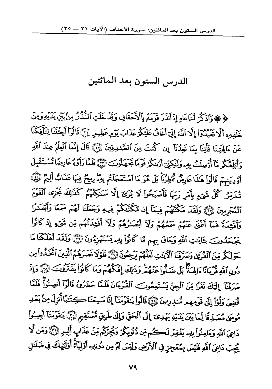 {وَاذْكُرْ أَخَا عَادٍ إِذْ أَنذَرَ قَوْمَهُ بِالْأَحْقَافِ وَقَدْ خَلَتْ النُّذُرُ مِن بَيْنِ يَدَيْهِ وَمِنْ خَلْفِهِ أَلَّا تَعْبُدُوا إِلَّا اللَّهَ إِنِّي أَخَافُ عَلَيْكُمْ عَذَابَ يَوْمٍ عَظِيمٍ (21) قَالُوا أَجِئْتَنَا لِتَأْفِكَنَا عَنْ آلِهَتِنَا فَأْتِنَا بِمَا تَعِدُنَا إِن كُنتَ مِنَ الصَّادِقِينَ (22) قَالَ إِنَّمَا الْعِلْمُ عِندَ اللَّهِ وَأُبَلِّغُكُم مَّا أُرْسِلْتُ بِهِ وَلَكِنِّي أَرَاكُمْ قَوْماً تَجْهَلُونَ (23) فَلَمَّا رَأَوْهُ عَارِضاً مُّسْتَقْبِلَ أَوْدِيَتِهِمْ قَالُوا هَذَا عَارِضٌ مُّمْطِرُنَا بَلْ هُوَ مَا اسْتَعْجَلْتُم بِهِ رِيحٌ فِيهَا عَذَابٌ أَلِيمٌ (24) تُدَمِّرُ كُلَّ شَيْءٍ بِأَمْرِ رَبِّهَا فَأَصْبَحُوا لَا يُرَى إِلَّا مَسَاكِنُهُمْ كَذَلِكَ نَجْزِي الْقَوْمَ الْمُجْرِمِينَ (25) وَلَقَدْ مَكَّنَّاهُمْ فِيمَا إِن مَّكَّنَّاكُمْ فِيهِ وَجَعَلْنَا لَهُمْ سَمْعاً وَأَبْصَاراً وَأَفْئِدَةً فَمَا أَغْنَى عَنْهُمْ سَمْعُهُمْ وَلَا أَبْصَارُهُمْ وَلَا أَفْئِدَتُهُم مِّن شَيْءٍ إِذْ كَانُوا يَجْحَدُونَ بِآيَاتِ اللَّهِ وَحَاقَ بِهِم مَّا كَانُوا بِهِ يَسْتَهْزِئُون (26) وَلَقَدْ أَهْلَكْنَا مَا حَوْلَكُم مِّنَ الْقُرَى وَصَرَّفْنَا الْآيَاتِ لَعَلَّهُمْ يَرْجِعُونَ (27) فَلَوْلَا نَصَرَهُمُ الَّذِينَ اتَّخَذُوا مِن دُونِ اللَّهِ قُرْبَاناً آلِهَةً بَلْ ضَلُّوا عَنْهُمْ وَذَلِكَ إِفْكُهُمْ وَمَا كَانُوا يَفْتَرُونَ (28) وَإِذْ صَرَفْنَا إِلَيْكَ نَفَراً مِّنَ الْجِنِّ يَسْتَمِعُونَ الْقُرْآنَ فَلَمَّا حَضَرُوهُ قَالُوا أَنصِتُوا فَلَمَّا قُضِيَ وَلَّوْا إِلَى قَوْمِهِم مُّنذِرِينَ (29) قَالُوا يَا قَوْمَنَا إِنَّا سَمِعْنَا كِتَاباً أُنزِلَ مِن بَعْدِ مُوسَى مُصَدِّقاً لِّمَا بَيْنَ يَدَيْهِ يَهْدِي إِلَى الْحَقِّ وَإِلَى طَرِيقٍ مُّسْتَقِيمٍ (30) يَا قَوْمَنَا أَجِيبُوا دَاعِيَ اللَّهِ وَآمِنُوا بِهِ يَغْفِرْ لَكُم مِّن ذُنُوبِكُمْ وَيُجِرْكُم مِّنْ عَذَابٍ أَلِيمٍ (31) وَمَن لَّا يُجِبْ دَاعِيَ اللَّهِ فَلَيْسَ