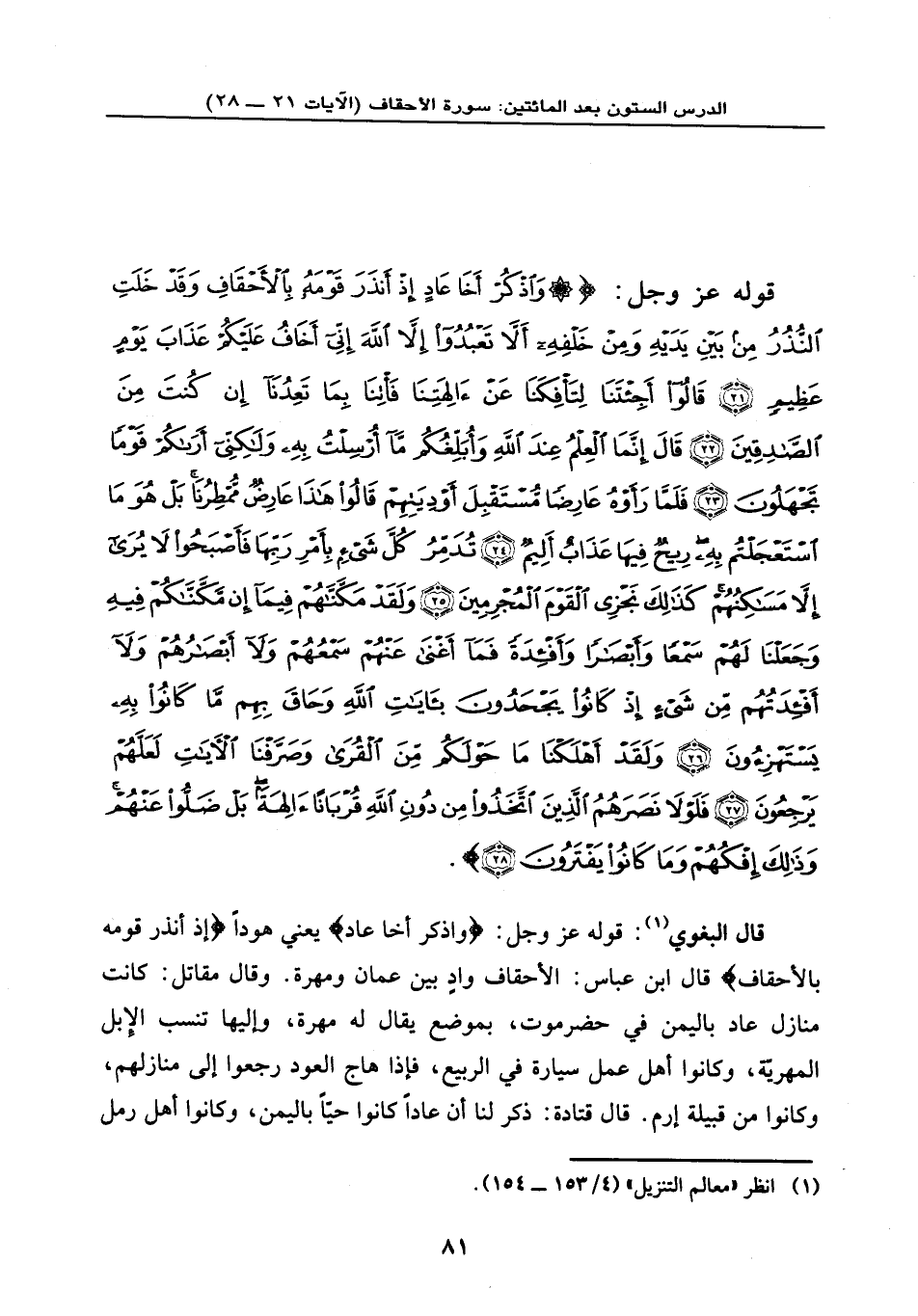 قوله عز وجل: {وَاذْكُرْ أَخَا عَادٍ إِذْ أَنذَرَ قَوْمَهُ بِالْأَحْقَافِ وَقَدْ خَلَتْ النُّذُرُ مِن بَيْنِ يَدَيْهِ وَمِنْ خَلْفِهِ أَلَّا تَعْبُدُوا إِلَّا اللَّهَ إِنِّي أَخَافُ عَلَيْكُمْ عَذَابَ يَوْمٍ عَظِيمٍ (21) قَالُوا أَجِئْتَنَا لِتَأْفِكَنَا عَنْ آلِهَتِنَا فَأْتِنَا بِمَا تَعِدُنَا إِن كُنتَ مِنَ الصَّادِقِينَ (22) قَالَ إِنَّمَا الْعِلْمُ عِندَ اللَّهِ وَأُبَلِّغُكُم مَّا أُرْسِلْتُ بِهِ وَلَكِنِّي أَرَاكُمْ قَوْماً تَجْهَلُونَ (23) فَلَمَّا رَأَوْهُ عَارِضاً مُّسْتَقْبِلَ أَوْدِيَتِهِمْ قَالُوا هَذَا عَارِضٌ مُّمْطِرُنَا بَلْ هُوَ مَا اسْتَعْجَلْتُم بِهِ رِيحٌ فِيهَا عَذَابٌ أَلِيمٌ (24) تُدَمِّرُ كُلَّ شَيْءٍ بِأَمْرِ رَبِّهَا فَأَصْبَحُوا لَا يُرَى إِلَّا مَسَاكِنُهُمْ كَذَلِكَ نَجْزِي الْقَوْمَ الْمُجْرِمِينَ (25) وَلَقَدْ مَكَّنَّاهُمْ فِيمَا إِن مَّكَّنَّاكُمْ فِيهِ وَجَعَلْنَا لَهُمْ سَمْعاً وَأَبْصَاراً وَأَفْئِدَةً فَمَا أَغْنَى عَنْهُمْ سَمْعُهُمْ وَلَا أَبْصَارُهُمْ وَلَا أَفْئِدَتُهُم مِّن شَيْءٍ إِذْ كَانُوا يَجْحَدُونَ بِآيَاتِ اللَّهِ وَحَاقَ بِهِم مَّا كَانُوا بِهِ يَسْتَهْزِئُون (26) وَلَقَدْ أَهْلَكْنَا مَا حَوْلَكُم مِّنَ الْقُرَى وَصَرَّفْنَا الْآيَاتِ لَعَلَّهُمْ يَرْجِعُونَ (27) فَلَوْلَا نَصَرَهُمُ الَّذِينَ اتَّخَذُوا مِن دُونِ اللَّهِ قُرْبَاناً آلِهَةً بَلْ ضَلُّوا عَنْهُمْ وَذَلِكَ إِفْكُهُمْ وَمَا كَانُوا يَفْتَرُونَ (28) } .
