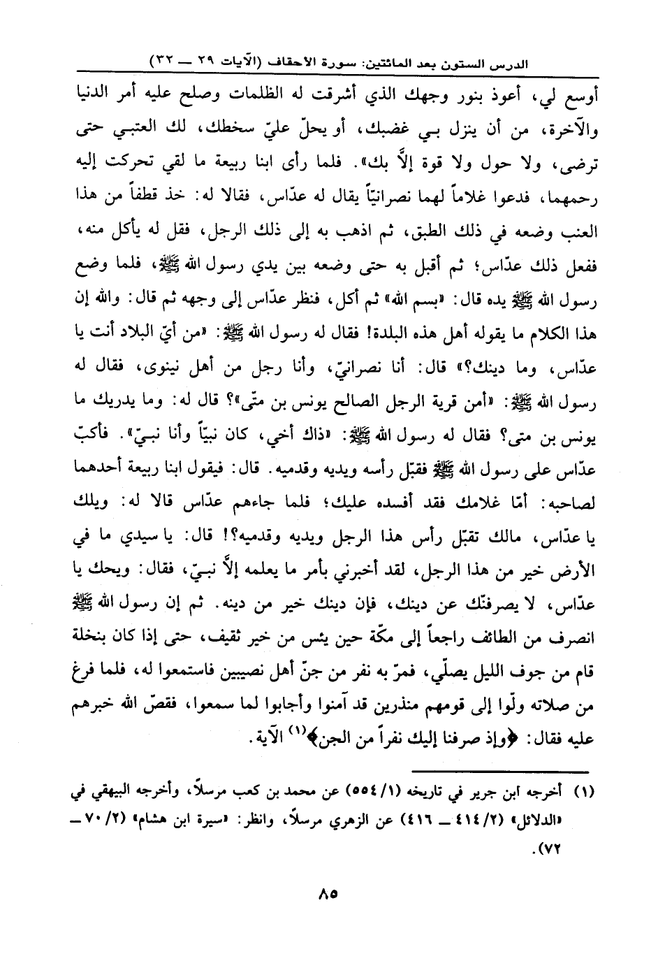 خذ قطفًا من هذا العنب وضعه في ذلك الطبق، ثم اذهب به إلى ذلك الرجل، فقل له يأكل منه، ففعل ذلك عداس؛ ثم أقبل به حتى وضعه بين يدي رسول الله - صلى الله عليه وسلم - فلما وضع رسول الله - صلى الله عليه وسلم - يده قال: «بسم الله» ثم أكل، فنظر عداس إلى وجهه ثم قال: والله إن هذا الكلام ما يقوله أهل هذه البلدة! فقال له رسول الله - صلى الله عليه وسلم -: «من أي البلاد أنت يا عداس وما دينك» ؟ قال: أنا نصراني، وأنا رجل من أهل نينوى، فقال له رسول الله - صلى الله عليه وسلم -: «أمن قرية الرجل الصالح يونس بن متى» ؟ قال له: وما يدريك ما يونس بن متى؟ فقال له رسول الله - صلى الله عليه وسلم -: «ذاك أخي، كان نبيًا وأنا نبي» . فأكب عداس على رسول الله - صلى الله عليه وسلم - فقبل رأسه ويديه وقدميه. قال: فيقول ابنا ربيعة أحدهما لصاحبه: أما غلامك فقد أفسده عليك؛ فلما جاءهم عداس قالا له: ويلك ياعداس مالك تقبل رأس هذا الرجل ويديه وقدميه؟ ! قال: يا سيدي ما في الأرض خير من هذا الرجل، لقد أخبرني بأمر ما يعلمه إلا نبي، فقالا: ويحك يا عداس، لا يصرفنك عن دينك، فإن دينك خير من دينه. ثم إن رسول الله - صلى الله عليه وسلم - انصرف من الطائف راجعًا إلى مكة حين يئس من خير ثقيف، حتى إذا كان بنخلة قام من جوف الليل يصلي فمر به نفر من جن أهل نصيبين فاستمعوا له، فلما فرغ من صلاته ولوا إلى قومهم منذرين قد آمنوا وأجابوا لما سمعوا، فقص الله خبرهم عليه فقال: {وَإِذْ صَرَفْنَا إِلَيْكَ نَفَراً مِّنَ الْجِنِّ} الآية،