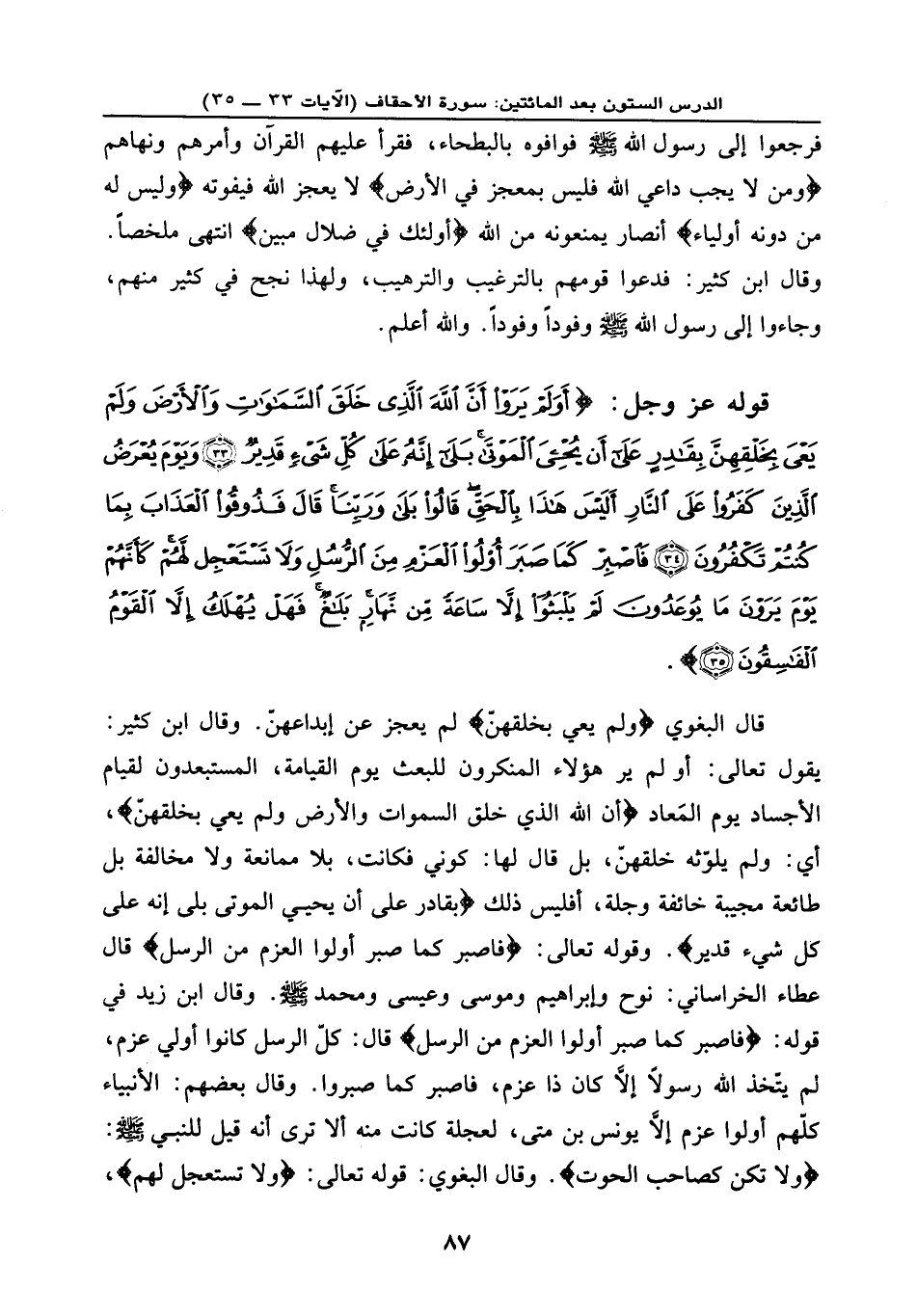 قوله عز وجل: {أَوَلَمْ يَرَوْا أَنَّ اللَّهَ الَّذِي خَلَقَ السَّمَاوَاتِ وَالْأَرْضَ وَلَمْ يَعْيَ بِخَلْقِهِنَّ بِقَادِرٍ عَلَى أَنْ يُحْيِيَ الْمَوْتَى بَلَى إِنَّهُ عَلَى كُلِّ شَيْءٍ قَدِيرٌ (33) وَيَوْمَ يُعْرَضُ الَّذِينَ كَفَرُوا عَلَى النَّارِ أَلَيْسَ هَذَا بِالْحَقِّ قَالُوا بَلَى وَرَبِّنَا قَالَ فَذُوقُوا الْعَذَابَ بِمَا كُنتُمْ تَكْفُرُونَ (34) فَاصْبِرْ كَمَا صَبَرَ أُوْلُوا الْعَزْمِ مِنَ الرُّسُلِ وَلَا تَسْتَعْجِل لَّهُمْ كَأَنَّهُمْ يَوْمَ يَرَوْنَ مَا يُوعَدُونَ لَمْ يَلْبَثُوا إِلَّا سَاعَةً مِّن نَّهَارٍ بَلَاغٌ فَهَلْ يُهْلَكُ إِلَّا الْقَوْمُ الْفَاسِقُونَ (35) } .
