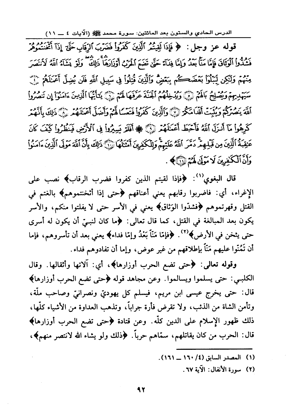 قال البغوي: {فَإِذا لَقِيتُمُ الَّذِينَ كَفَرُوا فَضَرْبَ الرِّقَابِ} نصب على الإغراء، أي: فاضربوا رقابهم، يعني: أعناقهم، {حَتَّى إِذَا أَثْخَنتُمُوهُمْ} بالغتم في القتل وقهرتموهم {فَشُدُّوا الْوَثَاقَ} يعني: في الأسر حتى لا يفلتوا منكم، والأسر يكون بعد المبالغة في القتل، كما قال تعالى: {مَا كَانَ لِنَبِيٍّ أَن يَكُونَ لَهُ أَسْرَى حَتَّى يُثْخِنَ فِي الأَرْضِ} ، {فَإِمَّا مَنّاً بَعْدُ وَإِمَّا فِدَاء} يعني: بعد أن تأسروهم فإما أن تَمُنّوا عليهم منا بإطلاقهم من غير عوض، وإما أن تفادوهم فداء.