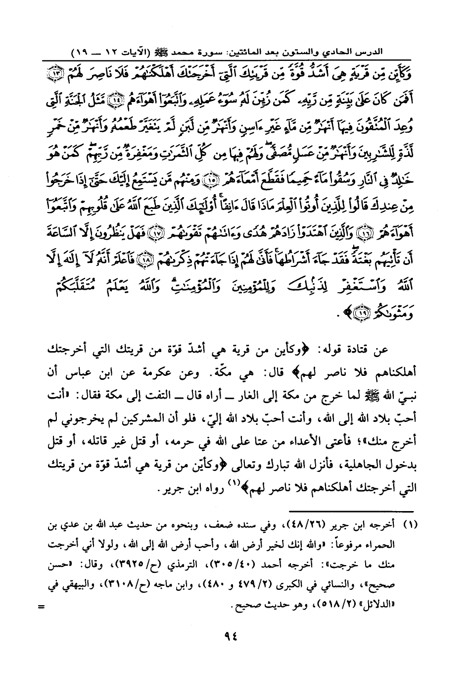 عن قتادة: قوله: {وَكَأَيِّن مِّن قَرْيَةٍ هِيَ أَشَدُّ قُوَّةً مِّن قَرْيَتِكَ الَّتِي أَخْرَجَتْكَ أَهْلَكْنَاهُمْ فَلَا نَاصِرَ لَهُمْ} ، قال: هي: مكة. عن عكرمة عن ابن عباس أن نبي الله - صلى الله عليه وسلم - لما خرج من مكة إلى الغار - أراه قال -: التفت إلى مكة فقال: «أنت أحب بلاد الله إلى الله، وأنت أحب بلاد الله إليّ، فلو أن المشركين لم يخرجوني لم أخرج منك» ؛ فأعتى الأعداء من عتا على الله في حرمه، أو قتل غير قاتله، أو قتل بدخول الجاهلية، فأنزل الله تبارك وتعالى: {وَكَأَيِّن مِّن قَرْيَةٍ هِيَ أَشَدُّ قُوَّةً مِّن قَرْيَتِكَ الَّتِي أَخْرَجَتْكَ أَهْلَكْنَاهُمْ فَلَا نَاصِرَ لَهُمْ} . رواه ابن جرير.