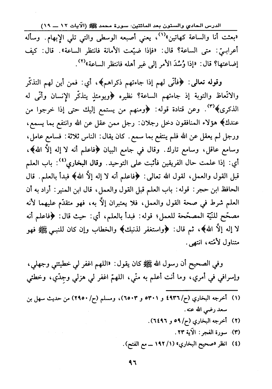 عقل عن الله وانتفع بما يسمع، ورجل لم يعقل عن الله فلم ينتفع بما سمع. كان يقال: الناس ثلاثة: فسامع عامل، وسامع عاقل، وسامع تارك. وقال في جامع البيان: {فَاعْلَمْ أَنَّهُ لَا إِلَهَ إِلَّا اللَّهُ} ، أي: إذا علمت حال الفريقين فاثبت على التوحيد. وقال البخاري: باب العلم قبل القول والعمل، لقول الله تعالى: {فَاعْلَمْ أَنَّهُ لَا إِلَهَ إِلَّا اللَّهُ} فبدأ بالعلم. قال الحافظ ابن حجر: قوله: باب العلم قبل القول والعمل، قال ابن المنير: أراد به أن العلم شرط في صحة القول والعمل، فلا يعتبران إلا به فهو متقدم عليهما لأنه مصحح للنية المصححة للعمل؛ قوله: فبدأ بالعلم، أي: حيث قال: {فَاعْلَمْ أَنَّهُ لَا إِلَهَ إِلَّا اللَّهُ} ، ثم قال: {وَاسْتَغْفِرْ لِذَنبِكَ} والخطاب وإن كان للنبي - صلى الله عليه وسلم - فهو متناول لأمته. انتهى.