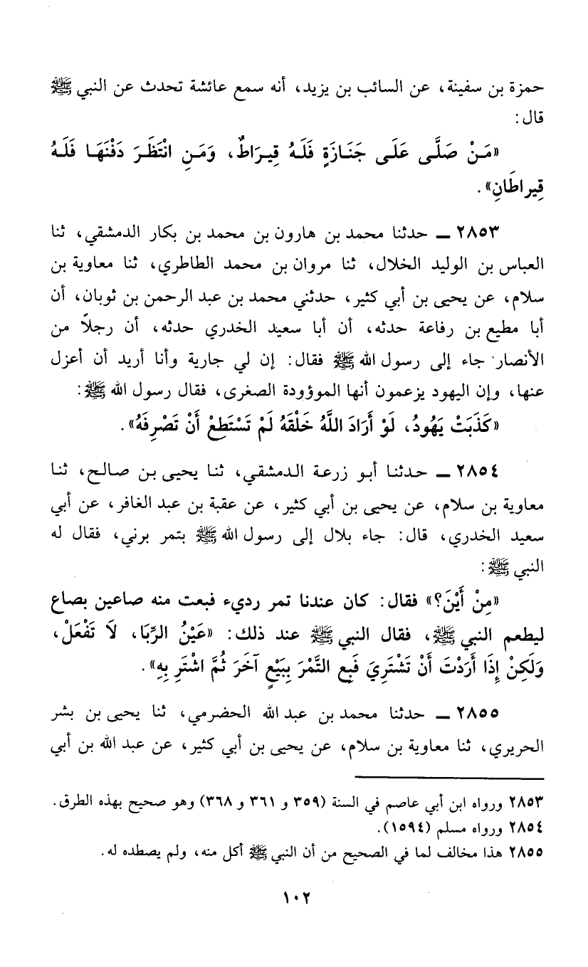 2854 - حَدَّثَنَا أَبُو زُرْعَةَ الدِّمَشْقِيُّ، ثَنَا يَحْيَى بْنُ صَالِحٍ، ثَنَا مُعَاوِيَةُ بْنُ سَلَّامٍ، عَنْ يَحْيَى بْنِ أَبِي كَثِيرٍ، عَنْ عُقْبَةَ بْنِ عَبْدِ الْغَافِرِ، عَنْ أَبِي سَعِيدٍ الْخُدْرِيُّ، قَالَ: جَاءَ بِلَالٌ إِلَى رَسُولِ اللَّهِ صَلَّى اللهُ عَلَيْهِ وَسَلَّمَ بِتَمْرٍ بَرْنِيٍّ، فَقَالَ لَهُ النَّبِيُّ صَلَّى اللهُ عَلَيْهِ وَسَلَّمَ: «مِنْ أَيْنَ؟» فَقَالَ: كَانَ عِنْدَنَا تَمْرٌ رَدِيءٌ فَبِعْتُ مِنْهُ صَاعَيْنِ بِصَاعٍ لِيَطْعَمَ النَّبِيُّ صَلَّى اللهُ عَلَيْهِ وَسَلَّمَ، فَقَالَ النَّبِيُّ صَلَّى اللهُ عَلَيْهِ وَسَلَّمَ عِنْدَ ذَلِكَ: «§عَيْنُ الرِّبَا، لَا تَفْعَلْ، وَلَكِنْ إِذَا أَرَدْتَ أَنْ تَشْتَرِيَ فَبِعِ التَّمْرَ بِبَيْعٍ آخِرَ، ثُمَّ اشْتَرِ بِهِ»