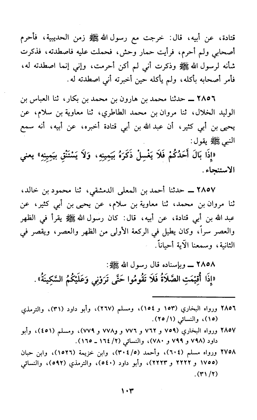 2856 - حَدَّثَنَا مُحَمَّدُ بْنُ هَارُونَ بْنِ مُحَمَّدِ بْنِ بَكَّارٍ، ثَنَا الْعَبَّاسُ بْنُ الْوَلِيدِ الْخَلَّالُ، ثَنَا مَرْوَانُ بْنُ مُحَمَّدِ الطَّاطَرِيُّ، ثَنَا مُعَاوِيَةُ بْنُ سَلَّامٍ، عَنْ يَحْيَى بْنِ أَبِي كَثِيرٍ، أَنَّ عَبْدَ اللَّهِ بْنَ أَبِي قَتَادَةَ، أَخْبَرَهُ، عَنْ أَبِيهِ، أَنَّهُ سَمِعَ النَّبِيَّ صَلَّى اللهُ عَلَيْهِ وَسَلَّمَ يَقُولُ: «§إِذَا بَالَ أَحَدُكُمْ فَلَا يَغْسِلْ ذَكَرَهُ بِيَمِينِهِ، وَلَا يَسْتَنْقِ بِيَمِينِهِ» يَعْنِي الِاسْتِنْجَاءَ