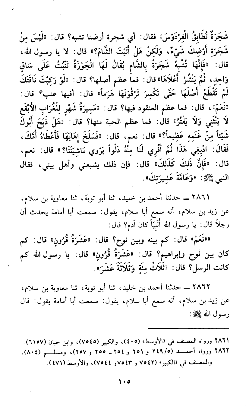 2861 - حَدَّثَنَا أَحْمَدُ بْنُ خُلَيْدٍ، ثَنَا أَبُو تَوْبَةَ، ثَنَا مُعَاوِيَةُ بْنُ سَلَّامٍ، عَنْ زَيْدِ بْنِ سَلَّامٍ، أَنَّهُ سَمِعَ أَبَا سَلَّامٍ، يَقُولُ: سَمِعْتُ أَبَا أُمَامَةَ، يُحَدِّثُ أَنَّ رَجُلًا، قَالَ: يَا رَسُولَ اللَّهِ أنبيًا كَانَ آدَمُ؟ قَالَ: «§نَعَمْ» قَالَ: كَمْ بَيْنَهُ وَبَيْنَ نُوحٍ؟ قَالَ: «عَشْرَةُ قُرُونٍ» قَالَ: كَمْ كَانَ بَيْنَ نُوحٍ وَإِبْرَاهِيمَ؟ قَالَ: «عَشْرَةُ قُرُونٍ» قَالَ: يَا رَسُولَ اللَّهِ كَمْ كَانَتِ الرُّسُلُ؟ قَالَ: «ثَلَاثَ مِئَةٍ وَثَلَاثَةَ عَشَرَ»