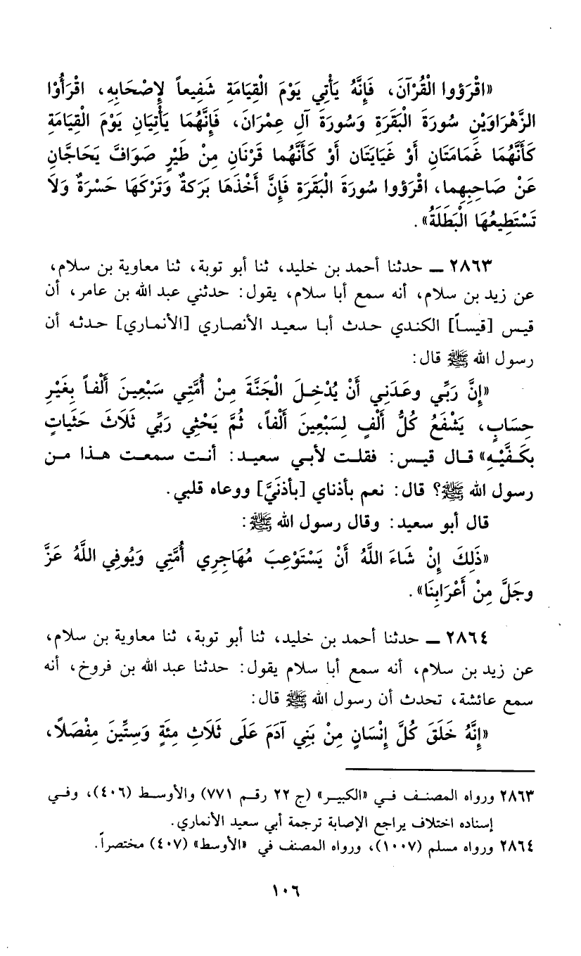2863 - حَدَّثَنَا أَحْمَدُ بْنُ خُلَيْدٍ، ثَنَا أَبُو تَوْبَةَ، ثَنَا مُعَاوِيَةُ بْنُ سَلَّامٍ، عَنْ زَيْدِ بْنِ سَلَّامٍ، أَنَّهُ سَمِعَ أَبَا سَلَّامٍ، يَقُولُ: حَدَّثَنِي عَبْدُ اللَّهِ بْنُ عَامِرٍ، أَنَّ قَيْسًا الْكِنْدِيَّ، حَدَّثَ أَنَّ أَبَا سَعِيدٍ الْأَنْصَارِيَّ [الْأَنْمَارِيَّ] ، حَدَّثَهُ أَنَّ رَسُولَ اللَّهِ صَلَّى اللهُ عَلَيْهِ وَسَلَّمَ قَالَ: «إِنَّ §رَبِّي وَعَدَنِي أَنْ يُدْخِلَ الْجَنَّةَ مِنْ أُمَّتِي سَبْعِينَ أَلْفًا بِغَيْرِ حِسَابٍ، يَشْفَعُ كُلُّ أَلْفٍ لِسَبْعِينَ أَلْفًا، ثُمَّ يَحْثِي رَبِّي ثَلَاثَ حَثَيَاتٍ بِكَفَّيْهِ» قَالَ قَيْسٌ: فَقُلْتُ لِأَبِي سَعِيدٍ: أَنْتَ سَمِعْتَ هَذَا مِنْ رَسُولِ اللَّهِ صَلَّى اللهُ عَلَيْهِ وَسَلَّمَ؟ قَالَ: نَعَمْ بِأُذُنَايَ [بِأُذُنِيَّ] وَوَعَاهُ قَلْبِي قَالَ أَبُو سَعِيدٍ: وَقَالَ رَسُولُ اللَّهِ صَلَّى اللهُ عَلَيْهِ وَسَلَّمَ: «ذَلِكَ إِنْ شَاءَ اللَّهُ أَنْ يَسْتَوْعِبَ مُهَاجِرِي أُمَّتِي وَيُوفِي اللَّهُ عَزَّ وَجَلَّ مِنْ أَعْرَابِنَا»