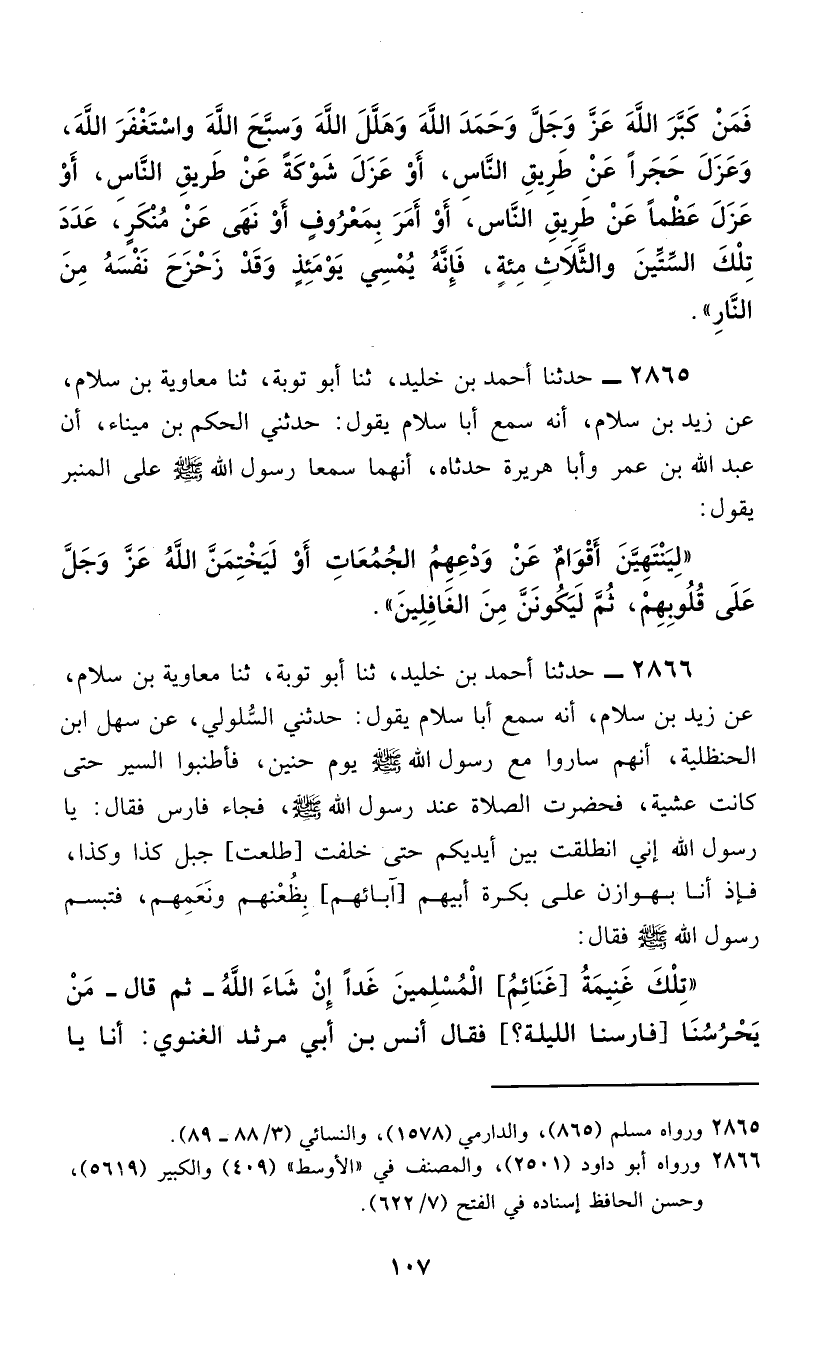 2866 - حَدَّثَنَا أَحْمَدُ بْنُ خُلَيْدٍ، ثَنَا أَبُو تَوْبَةَ، ثَنَا مُعَاوِيَةُ بْنُ سَلَّامٍ، عَنْ زَيْدِ بْنِ سَلَّامٍ، أَنَّهُ سَمِعَ أَبَا سَلَّامٍ، يَقُولُ: حَدَّثَنِي السَّلُولِيُّ، عَنْ سَهْلِ ابْنِ الْحَنْظَلِيَّةِ، أَنَّهُمْ سَارُوا مَعَ رَسُولِ اللَّهِ صَلَّى اللهُ عَلَيْهِ وَسَلَّمَ يَوْمَ حُنَيْنٍ، فَأَطْنَبُوا السَّيْرَ حَتَّى كَانَتْ عَشِيَّةً، فَحَضَرَتِ الصَّلَاةُ عِنْدَ رَسُولِ اللَّهِ صَلَّى اللهُ عَلَيْهِ وَسَلَّمَ، فَجَاءَ فَارِسٌ فَقَالَ: يَا رَسُولَ اللَّهِ، إِنِّي انْطَلَقْتُ بَيْنَ أَيْدِيكُمْ حَتَّى خَلَفْتُ [طَلَعَتُ] جَبَلَ كَذَا وَكَذَا، فَإِذْ أَنَا بِهَوَازِنَ عَلَى بَكْرَةِ أَبِيهِمْ [آبَائِهِمْ] بِظُعْنِهِمْ وَنَعَمِهِمْ، فَتَبَسَّمَ رَسُولُ اللَّهِ صَلَّى اللهُ عَلَيْهِ وَسَلَّمَ فَقَالَ: §«تِلْكَ غَنِيمَةُ [غَنَائِمُ] الْمُسْلِمِينَ غَدًا إِنَّ شَاءَ اللَّهُ - ثُمَّ قَالَ - مَنْ يَحْرُسُنَا [فَارِسُنَا اللَّيْلَةَ] ؟» فَقَالَ أَنَسُ بْنُ أَبِي مَرْثَدٍ الْغَنَوِيُّ: أَنَا يَا -[108]- رَسُولَ اللَّهِ، قَالَ: «ارْكَبْ» فَرَكِبَ فَرَسًا فَجَاءَ إِلَى رَسُولِ اللَّهِ صَلَّى اللهُ عَلَيْهِ وَسَلَّمَ، فَقَالُ لَهُ رَسُولُ اللَّهِ صَلَّى اللهُ عَلَيْهِ وَسَلَّمَ: «اسْتَقْبَلْ هَذَا الشِّعْبَ حَتَّى تَكُونَ فِي أَعْلَاهُ، وَلَا نُغَرَّنَّ مِنْ قِبَلَكَ اللَّيْلَةَ» فَلَمَّا أَصْبَحـ[ْنَا] خَرَجَ رَسُولُ اللَّهِ صَلَّى اللهُ عَلَيْهِ وَسَلَّمَ إِلَى مُصَلَّاهُ فَصَلَّى رَكْعَتَيْنٍ، ثُمَّ قَالَ: «هَلْ [أَ] حْسَسْتُمْ فَارِسَكُمْ؟» فَقَالَ رَجُلٌ: يَا رَسُولَ اللَّهِ مَا أَحْسَسْنَاهُ، فَثَوَّبَ بِالصَّلَاةِ، فَجَعَلَ رَسُولُ اللَّهِ صَلَّى اللهُ عَلَيْهِ وَسَلَّمَ وَهُوَ فِي الصَّلَاةِ يَلْتَفِتُ فِي [إِلَى] الشِّعْبِ حَتَّى إِذَا قَضَى صَلَاتَهُ وَسَلَّمَ، قَالَ: «أَبْشِرُوا فَقَدْ جَاءَكُمْ فَارِسُكُمْ» فَجَعَلْنَا نَنْظُرُ إِلَى خِلَالِ الشَّجَرِ فِي الشِّعْبِ، فَإِذَا هُوَ [قَدْ] جَاءَ، حَتَّى وَقَفَ عَلَى رَسُولِ اللَّهِ صَلَّى اللهُ عَلَيْهِ وَسَلَّمَ فَقَالَ: إِنِّي [قَدِ] انْطَلَقْتُ حَتَّى كُنْتُ فِي أَعْلَى [هَذَا] الشِّعْبِ حَيْثُ أَمَرَنِي رَسُولُ اللَّهِ صَلَّى اللهُ عَلَيْهِ وَسَلَّمَ، فَلَمَّا أَصْبَحْتُ اطَّلَعْتُ الشِّعْبَيْنِ كِلَيْهِمَا، فَنَظَرْتُ فَلَمْ أَرَ أَحَدًا، فَقَالَ لَهُ رَسُولُ اللَّهِ صَلَّى اللهُ عَلَيْهِ وَسَلَّمَ: «نَزَلْتَ اللَّيْلَةَ؟» فَقَالَ: لَا إِلَّا مُصَلِّيًا أَوْ قَاضِي حَاجَةً، فَقَالَ رَسُولُ اللَّهِ صَلَّى اللهُ عَلَيْهِ وَسَلَّمَ: «قَدْ أَوْجَبْتَ، فَلَا عَلَيْكَ أَنْ تَعْمَلَ غَيْرَهَا»
