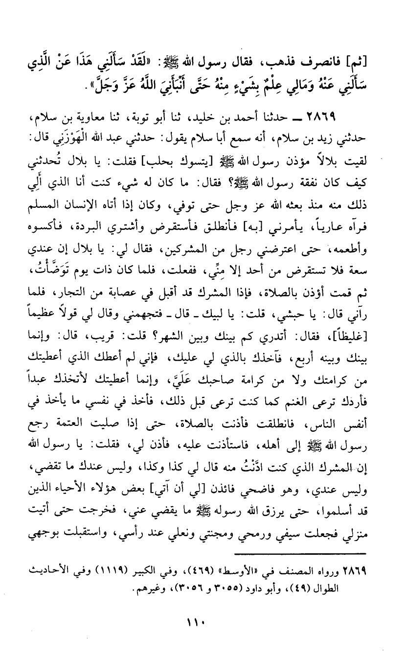 2869 - حَدَّثَنَا أَحْمَدُ بْنُ خُلَيْدٍ، ثَنَا أَبُو تَوْبَةَ، ثَنَا مُعَاوِيَةُ بْنُ سَلَّامٍ، حَدَّثَنِي زَيْدُ بْنُ سَلَّامٍ، أَنَّهُ سَمِعَ أَبَا سَلَّامٍ، يَقُولُ: حَدَّثَنِي عَبْدُ اللَّهِ الْهَوْزَنِيُّ، قَالَ: لَقِيتُ بِلَالًا مُؤَذِّنَ رَسُولِ اللَّهِ صَلَّى اللهُ عَلَيْهِ وَسَلَّمَ [يَتَسَوَّكُ بِحَلَبٍ] ، فَقُلْتُ: يَا بِلَالُ، تُحَدِّثُنِي كَيْفَ كَانَ نَفَقَةُ رَسُولِ اللَّهِ صَلَّى اللهُ عَلَيْهِ وَسَلَّمَ؟ فَقَالَ: مَا كَانَ لَهُ شَيْءٌ كُنْتُ أَنَا الَّذِي أَلِي ذَلِكَ مِنْهُ مُنْذُ بَعَثَهُ اللَّهُ عَزَّ وَجَلَّ حَتَّى تُوُفِّيَ، وَكَانَ إِذَا أَتَاهُ الْإِنْسَانُ الْمُسْلِمُ فَرَآهُ عَارِيًا، يَأْمُرُنِي [بِهِ] ؛ فَأَنْطَلِقُ فَأَسْتَفْرِضُ وَأَشْتَرِي الْبُرْدَةَ، فَأَكْسُوهُ وَأُطْعِمُهُ، حَتَّى اعْتَرَضَنِي رَجُلٌ مِنَ الْمُشْرِكِينَ، فَقَالَ لِي: يَا بِلَالُ، إِنَّ عِنْدِي سَعَةٌ، فَلَا تَسْتَقْرِضْ مِنْ أَحَدٍ إِلَّا مِنِّي، فَفَعَلْتُ، فَلَمَّا كَانَ ذَاتَ يَوْمٍ تَوَضَّأْتُ، ثُمَّ قُمْتُ أُؤَذِّنُ بِالصَّلَاةِ، فَإِذَا الْمُشْرِكُ قَدْ أَقْبَلَ فِي عِصَابَةٍ مِنَ التُّجَّارِ، فَلَمَّا رَآنِي، قَالَ: يَا حَبَشِيُّ، قُلْتُ: يَا لَبَّيْكَ - قَالَ - فَتَجَهَّمَنِي وَقَالَ لِي قَوْلًا عَظِيمًا [غَلِيظًا] ، فَقَالَ: أَتَدْرِي كَمْ بَيْنَكَ وَبَيْنَ الشَّهْرِ؟ قُلْتُ: قَرِيبٌ، قَالَ: وَإِنَّمَا بَيْنَكَ وَبَيْنَهُ أَرْبَعٌ، فَآخُذُكَ بِالَّذِي لِي عَلَيْكَ، فَإِنِّي لَمْ أُعْطِكَ الَّذِي أَعْطَيْتُكَ مِنْ كَرَامَتِكَ، وَلَا مِنْ كَرَامَةِ صَاحِبِكَ عَلَيَّ؛ وَإِنَّمَا أَعْطَيْتُكَ لِأَتَّخِذَكَ عَبْدًا فَأَرُدَّكَ تَرْعَى الْغَنَمَ كَمَا كُنْتَ تَرْعَى قَبْلَ ذَلِكَ، فَأَخَذَ فِي نَفْسِي مَا يَأْخُذُ فِي أَنْفُسِ النَّاسِ، فَانْطَلَقْتُ فَأَذَّنْتُ بِالصَّلَاةِ، حَتَّى إِذَا صَلَّيْتُ الْعَتَمَةَ رَجَعَ رَسُولُ اللَّهِ صَلَّى اللهُ عَلَيْهِ وَسَلَّمَ إِلَى أَهْلِهِ، فَاسْتَأْذَنْتُ عَلَيْهِ، فَأَذِنَ لِي، فَقُلْتُ: يَا رَسُولَ اللَّهِ، إِنَّ الْمُشْرِكَ الَّذِي كُنْتُ ادَّنْتُ مِنْهُ قَالَ لِي كَذَا وَكَذَا، وَلَيْسَ عِنْدَكَ مَا تَقْضِي، وَلَيْسَ عِنْدِي، وَهُوَ فَاضِحِي فَائْذَنْ [لِي أَنْ آتِيَ] بَعْضَ هَؤُلَاءِ الْأَحْيَاءِ الَّذِينَ قَدْ أَسْلَمُوا، حَتَّى يَرْزُقَ اللَّهُ رَسُولَ اللَّهِ صَلَّى اللهُ عَلَيْهِ وَسَلَّمَ مَا يَقْضِي عَنِّي، فَخَرَجْتُ حَتَّى أَتَيْتُ مَنْزِلِي فَجَعَلْتُ سَيْفِي وَرُمْحِي وَنَعْلِي عِنْدَ رَأْسِي، وَاسْتَقْبَلْتُ بِوَجْهِيَ -[111]-[الْأُفُقَ] فَكُلَّمَا نِمْتُ سَاعَةً انْتَبَهْتُ، فَإِذَا رَأَيْتُ عَلَيَّ لَيْلًا نِمْتُ، ثُمَّ [حَتَّى] انْشَقَّ عَمُودُ الصُّبْحِ الْأَوَّلِ، فَأَرَدْتُ أَنْ أَنْطَلِقَ، فَإِذَا إِنْسَانٌ يَسْعَى يَدْعُو: يَا بِلَالُ، أَجِبْ رَسُولَ اللَّهِ صَلَّى اللهُ عَلَيْهِ وَسَلَّمَ، فَانْطَلَقْتُ حَتَّى أَتَيْتُهُ وَإِذَا أَرْبَعُ رَكَائِبَ مُنَاخَاتٍ، عَلَيْهِنَّ أَحْمَالُهُنَّ، فَأَتَيْتُ رَسُولَ اللَّهِ صَلَّى اللهُ عَلَيْهِ وَسَلَّمَ فَاسْتَأْذَنْتُ، فَقَالَ لِي رَسُولُ اللَّهِ صَلَّى اللهُ عَلَيْهِ وَسَلَّمَ: «§أَبْشِرْ فَقَدْ جَاءَكَ اللَّهُ بِقَضَائِكَ» فَحَمِدْتُ اللَّهَ، وَقَالَ: «أَلَمْ تَمُرَّ عَلَى الرَّكَائِبِ الْمُنَاخَاتِ الْأَرْبَعِ؟» قُلْتُ: بَلَى، قَالَ: «فَإِنَّ لَكَ رِقَابَهُنَّ وَمَا عَلَيْهِنَّ، فَإِنَّ عَلَيْهِنَّ كِسْوَةً وَطَعَامٌ [طَعَامًا] أَهْدَاهُنَّ إِلَيَّ عَظِيمُ فَدَكَ، فَاقْبِضْهُنَّ، ثُمَّ اقْضِي دَيْنَكَ» ، فَفَعَلْتُ فَحَطَطْتُ عَنْهُنَّ أَحْمَالَهُنَّ، ثُمَّ عَقِلْتُهُنَّ، [ثُمَّ عَلَفْتُهُنَّ] ، ثُمَّ قُمْتُ إِلَى تَأْذِينِي لِصَلَاةِ ا