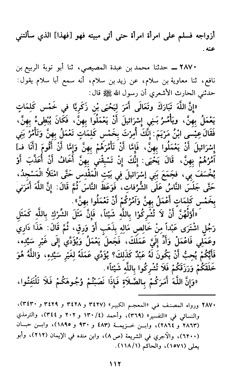 2870 - حَدَّثَنَا مُحَمَّدُ بْنُ عَبْدَةَ الْمِصِّيصِيُّ، ثَنَا أَبُو تَوْبَةَ الرَّبِيعُ بْنُ نَافِعٍ، ثَنَا مُعَاوِيَةُ بْنُ سَلَّامٍ، عَنْ زَيْدِ بْنِ سَلَّامٍ، أَنَّهُ سَمِعَ أَبَا سَلَّامٍ، يَقُولُ: حَدَّثَنِي الْحَارِثُ الْأَشْعَرِيُّ، أَنَّ رَسُولَ اللَّهِ صَلَّى اللهُ عَلَيْهِ وَسَلَّمَ قَالَ: §" إِنَّ اللَّهَ تَبَارَكَ وَتَعَالَى أَمَرَ لِيَحْيَى بْنِ زَكَرِيَّا فِي خَمْسِ كَلِمَاتٍ يَعْمَلُ بِهِنَّ، وَيَأْمُرُ بَنِي إِسْرَائِيلَ أَنْ يَعْمَلُوا بِهِنَّ، فَكَانَ يُبْطِئُ بِهِنَّ، فَقَالَ عِيسَى ابْنُ مَرْيَمَ: إِنَّكَ أُمِرْتَ بِخَمْسِ كَلِمَاتٍ تَعْمَلُ بِهِنَّ وَتَأْمُرُ بَنِي إِسْرَائِيلَ أَنْ يَعْمَلُوا بِهِنَّ، فَإِمَّا أَنْ تَأْمُرَهُمُ بِهِنَّ وَإِمَّا أَنْ أَقُومَ [أَنَا فَـ] آمُرَهُمْ بِهِنَّ، قَالَ يَحْيَى: إِنَّكَ إِنْ تَسْبِقْنِي بِهِنَّ أَخَافُ أَنْ أُعَذَّبَ أَوْ يُخْسَفَ بِي، فَجَمَعَ بَنِي إِسْرَائِيلَ فِي بَيْتِ الْمَقْدِسِ حَتَّى امْتَلَأَ الْمَسْجِدُ، حَتَّى جَلَسَ النَّاسُ عَلَى الشُّرُفَاتِ، فَوَعَظَ النَّاسُ، ثُمَّ قَالَ: إِنَّ اللَّهَ أَمَرَنِي بِخَمْسِ كَلِمَاتٍ أَعْمَلُ بِهِنَّ وَآمُرُكُمْ أَنْ تَعْمَلُوا بِهِنَّ، أَوَّلُهُنَّ أَنْ لَا تُشْرِكُوا بِاللَّهِ شَيْئًا، فَإِنَّ مِثْلَ الشِّرْكِ بِاللَّهِ كَمَثَلِ رَجُلٍ اشْتَرَى عَبْدًا مِنْ خَالِصِ مَالِهِ بِذَهَبٍ أَوْ وَرِقٍ، ثُمَّ قَالَ: هَذَا دَارِي وَعَمَلِي فَاعْمَلْ وَأَدِّ إِلَيَّ عَمَلَكَ، فَجَعَلَ يَعْمَلُ وَيُؤَدِّي إِلَى غَيْرِ سَيِّدِهِ، فَأَيُّكُمْ يُحِبُّ أَنْ يَكُونَ لَهُ عَبْدٌ كَذَلِكَ؟ يُؤَدِّي عَمَلُهُ لِغَيْرِ سَيِّدِهِ، وَاللَّهُ هُوَ خَلَقَكُمْ وَرَزَقَكُمْ فَلَا تُشْرِكُوا بِاللَّهِ شَيْئًا، وَإِنَّ اللَّهَ أَمَرَكُمْ بِالصَّلَاةِ فَإِذَا نَصَبْتُمْ وجُوهَكُمْ فَلَا تَلْتَفِتُوا -[113]-، فَإِنَّ اللَّهَ تَبَارَكَ وَتَعَالَى يَنْصُبُ وَجْهَهُ لِوَجْهِ عَبْدِهِ حِينَ يُصَلِّي، فَلَا يَصْرِفُ وَجْهُهُ عَنْهُ حَتَّى يَكُونَ هُوَ الَّذِي يَنْصَرِفُ، وَأَمَرَكُمْ بِالصِّيَامِ، فَإِنَّ مَثْلَ الصَّائِمِ مَثْلُ رَجُلٍ مَعَهُ صُرَّةُ مِسْكٍ، فَهُوَ فِي عِصَابَةٍ لَيْسَ مَعَ [أَحَدٍ] مِنْهُمْ مِسْكٌ غَيْرِهِ، كُلُّهُمْ يَشْتَهِي أَنْ يَجِدَ رِيحَهَا، وَإِنَّ [رِيحَ] فَمِ الصَّائِمِ أَطْيَبُ عِنْدَ اللَّهِ مِنْ رِيحِ الْمِسْكِ، وَأَمَرَكُمْ بِالصَّدَقَةِ، فَإِنَّ مَثْلَهَا كَمَثَلِ رَجُلٍ أَسَرَهُ الْعَدُوُّ، فَشَدُّوا يَدَهُ إِلَى عُنُقَهُ، فَقَدَّمُوهُ لِيَضْرِبُوا عُنُقَهُ، فَقَالَ: لَا تَقْتُلُونِي، فَإِنِّي أَفْدِي نَفْسِي مِنْكُمْ بِكَذَا وَكَذَا مِنَ الْمَالِ، فَأَرْسَلُوهُ فَجَعَلَ يَجْمَعُ حَتَّى فَدَى نَفْسَهُ مِنْهُ، [فـ] كَذَلِكَ الصَّدَقَةُ [يَفْتَدِي بِهَا الْعَبْدُ نَفْسَهُ مِنْ عَذَابِ اللَّهِ] ، وَأَمَرَكُمْ بِكَثْرَةِ ذَكْرِ اللَّهِ، فَإِنَّ مَثَلَ ذَكْرِ اللَّهِ كَمَثَلِ رَجُلٍ غَلَبَهُ الْعَدُوُّ فَانْطَلَقُوا فِي طَلَبِهِ سِرَاعًا [وَانْطَلَقَ] حَتَّى أَتَى حِصْنًا حَصِينًا، فَأَحْرَزَ نَفْسَهُ فِيهِ، فَكَذَلِكَ مِثْلُ الشَّيْطَانِ لَا يُحْرِزُ الْعِبَادُ مِنْهُ أَنْفُسَهُمْ إِلَّا بِذِكْرِ اللَّهِ عَزَّ وَجَلَّ " وَقَالَ رَسُولُ اللَّهِ صَلَّى اللهُ عَلَيْهِ وَسَلَّمَ: " وَأَنَا آمُرُكُمْ بِخَمْسِ [كَلِمَاتٍ] أَمَرَنِي [اللَّهُ] بِهِنَّ: الْجَمَاعَةُ وَالسَّمْعُ وَالطَّاعَةُ وَالْهِجْرَةُ وَالْجِهَادُ فِي سَبِيلِ اللَّهِ، فَمَنْ خَرَجَ مِنَ الْجَمَاعَةِ قِيدَ شِبْرٍ فَقَدْ خَلَعَ رِبْقَةَ الْإِسْلَامِ مِنْ رَأْسِهِ [عُنُقَهُ] "، وَقَالَ رَجُلٌ: يَا رَسُولَ اللَّهِ وَإِنَّ صَامَ وَصَلَّى؟ قَالَ: «وَإِنَّ صَامَ وَصَلَّى، فَادْعُوا بِدَعْوَةِ