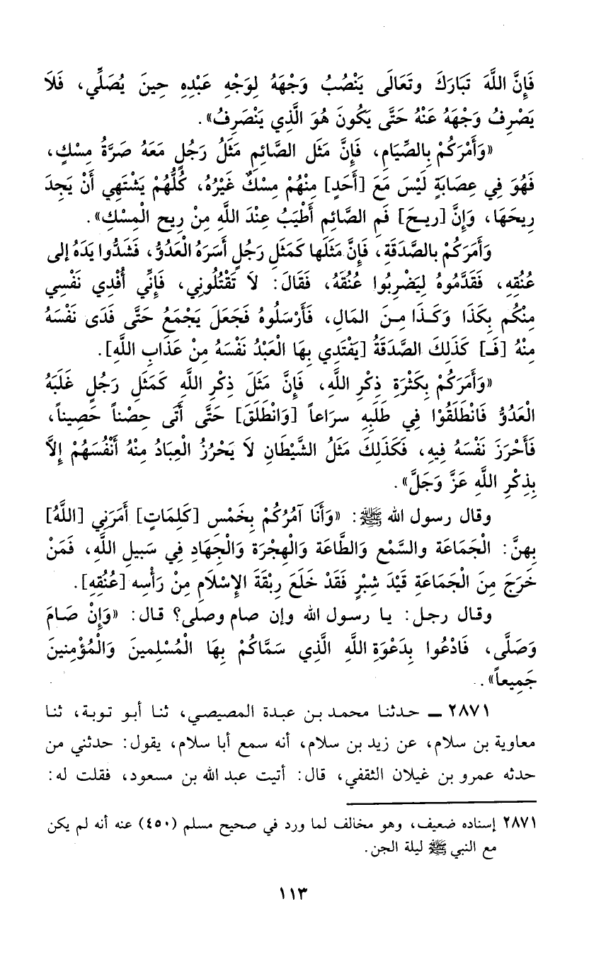 2871 - حَدَّثَنَا مُحَمَّدُ بْنُ عَبْدَةَ الْمِصِّيصِيُّ، ثَنَا أَبُو تَوْبَةَ، ثَنَا مُعَاوِيَةُ بْنُ سَلَّامٍ، عَنْ زَيْدِ بْنِ سَلَّامٍ، أَنَّهُ سَمِعَ أَبَا سَلَّامٍ، يَقُولُ: حَدَّثَنِي مَنْ، حَدَّثَهُ عَمْرُو بْنُ غَيْلَانَ الثَّقَفِيُّ، قَالَ: أَتَيْتُ عَبْدَ اللَّهِ بْنِ مَسْعُودٍ، فَقُلْتُ لَهُ -[114]-: حُدِّثْتُ أَنَّكَ، كُنْتَ مَعَ رَسُولِ اللَّهِ صَلَّى اللهُ عَلَيْهِ وَسَلَّمَ لَيْلَةَ وَفْدَ الْجِنِّ؟ فَقَالَ: أَجَلْ، فَقُلْتُ: حَدِّثْنِي كَيْفَ كَانَ شَأْنُهُ؟ قَالَ: " إِنَّ أَهْلَ الصُّفَّةِ أَخَذَ كُلُّ رَجُلٍ مِنْهُمْ رَجُلَيْنِ يُعَيِّشْهُمَا، وَتُرِكْتُ فَلَمْ يَأْخُذْنِي مِنْهُمْ أَحَدٌ، فَمَرَّ بِي رَسُولُ اللَّهِ صَلَّى اللهُ عَلَيْهِ وَسَلَّمَ، فَقَالَ: «مَنْ هَذَا؟» فَقُلْتُ: أَنَا ابْنُ مَسْعُودٍ، فَقَالَ: «مَا أَجِدُكَ أَحَدٌ يُعَشِّيكَ؟» قُلْتُ: لَا، قَالَ: «فَانْطَلِقْ لِعَلِيٍّ أَجِدُ لَكَ شَيْئًا» فَانْطَلَقْنَا حَتَّى أَتَى حُجْرَةَ أُمِّ سَلَمَةَ، فَتَرَكَنِي رَسُولُ اللَّهِ صَلَّى اللهُ عَلَيْهِ وَسَلَّمَ قَائِمًا وَدَخَلَ إِلَى أَهْلِهِ، ثُمَّ خَرَجَتِ الْجَارِيَةُ، فَقَالَتْ: يَا ابْنَ مَسْعُودٍ إِنَّ رَسُولَ اللَّهِ صَلَّى اللهُ عَلَيْهِ وَسَلَّمَ لَمْ يَجِدْ لَكَ عَيْشًا، فَارْجِعْ إِلَى مَضْجَعَكَ، فَرَجَعْتُ إِلَى الْمَسْجِدِ، فَجَمَعْتُ حَصَى الْمَسْجِدِ فَتَوَسَّدْتُهُ، وَالْتَفَفْتُ بِثَوْبِي، فَلَمْ أَلْبَثْ إِلَّا قَلِيلًا حَتَّى جَاءَتِ الْجَارِيَةُ، فَقَالَتْ: عَبْدَ اللَّهِ بْنَ مَسْعُودٍ أَجِبْ رَسُولَ اللَّهِ صَلَّى اللهُ عَلَيْهِ وَسَلَّمَ فَاتَّبَعْتُهَا وَأَنَا أَرْجُو الْعَشَاءَ، حَتَّى إِذَا بَلَغَتُ مَقَامِي خَرَجَ رَسُولُ اللَّهِ صَلَّى اللهُ عَلَيْهِ وَسَلَّمَ وَفِي يَدِهِ عَسِيبٌ مِنْ نَخْلٍ، فَعَرَضَ بِهِ عَلَى صَدْرِي، فَقَالَ: «انْطَلِقْ أَنْتَ مَعِي حَيْثُ أَنْطَلِقْ» قُلْتُ: مَا شَاءَ اللَّهُ، فَأَعَادَهَا عَلِيَّ ثَلَاثَ مَرَّاتٍ، كُلُّ ذَلِكَ أَقُولُ: مَا شَاءَ اللَّهُ، فَانْطَلَقَ وَانْطَلَقْتُ مَعَهُ حَتَّى أَتَيْنَا بَقِيعَ الْغَرْقَدِ، فَخَطَّ بِعَصَاهُ خَطًّا، ثُمَّ قَالَ: «اجْلِسْ فِيهَا وَلَا تَبْرَحْ حَتَّى آتِيَكَ» ثُمَّ انْطَلَقَ يَمْشِي وَأَنَا أَنْظُرُ إِلَيْهِ خِلَالَ النَّخْلِ، حَتَّى إِذَا كَانَ مِنْ حَيْثُ أَرَاهُ ثَارَتْ مِثْلَ الْعُجَاجَةِ السَّوْدَاءِ، فَفَرِقْتُ فَقُلْتُ أَلْحَقُ بِرَسُولِ اللَّهِ صَلَّى اللهُ عَلَيْهِ وَسَلَّمَ، فَإِنِّي أَظُنُّ هَذِهِ هَوَازِنَ مَكَرُوا بِرَسُولِ اللَّهِ صَلَّى اللهُ عَلَيْهِ وَسَلَّمَ لِيَقْتُلُوهُ، فَأَسْعَى إِلَى الْبُيُوتِ فَأَسْتَغِيثُ النَّاسَ، فَذَكَرْتُ أَنَّ رَسُولَ اللَّهِ صَلَّى اللهُ عَلَيْهِ وَسَلَّمَ أَوْصَانِي أَنْ لَا أَبْرَحَ مَكَانِي الَّذِي أَنَا فِيهِ، فَسَمِعْتُ رَسُولَ اللَّهِ صَلَّى اللهُ عَلَيْهِ وَسَلَّمَ يَقْرَعُهُمْ بِعَصَاهُ، وَيَقُولُ: «اجْلِسُوا» فَجَلَسُوا حَتَّى كَادَ يَنْشَقُّ عَمُودُ الصُّبْحِ، ثُمَّ ثَارُوا وَذَهَبُوا، فَأَتَانِي رَسُولُ اللَّهِ صَلَّى اللهُ عَلَيْهِ وَسَلَّمَ فَقَالَ، «أَنِمْتَ بَعْدِي؟» قُلْتُ: لَا وَاللَّهِ، لَقَدْ فَزِعْتُ الْفَزْعَةَ الْأُولَى حَتَّى أَرَدْتُ أَنْ آتِيَ الْبُيُوتَ فَأَسْتَغِيثَ، حَتَّى سَمِعْتُكَ تَقْرَعُهُمْ بِعَصَاكَ، وَكُنْتُ أَظُنُّهَا هَوَازِنَ مَكَرُوا بِرَسُولِ اللَّهِ صَلَّى اللهُ عَلَيْهِ وَسَلَّمَ لِيَقْتُلُوهُ، قَالَ: §«لَوأَنَّكَ خَرَجْتَ مِنْ هَذِهِ الْحَلَقَةِ مَا أَمِنْتُ عَلَيْكَ أَنْ يَخْطَفَكَ بَعْضُهُمْ، فَهَلْ رَأَيْتَ مِنَ شَيْءٍ مِنْهُمْ؟» قُلْتُ: رَأَيْتُ رِجَالًا سُودًا مُسْتَدْبِرِينَ بِثِيَابٍ بِيضٍ، فَقَالَ رَسُولُ اللَّهِ صَلَّ