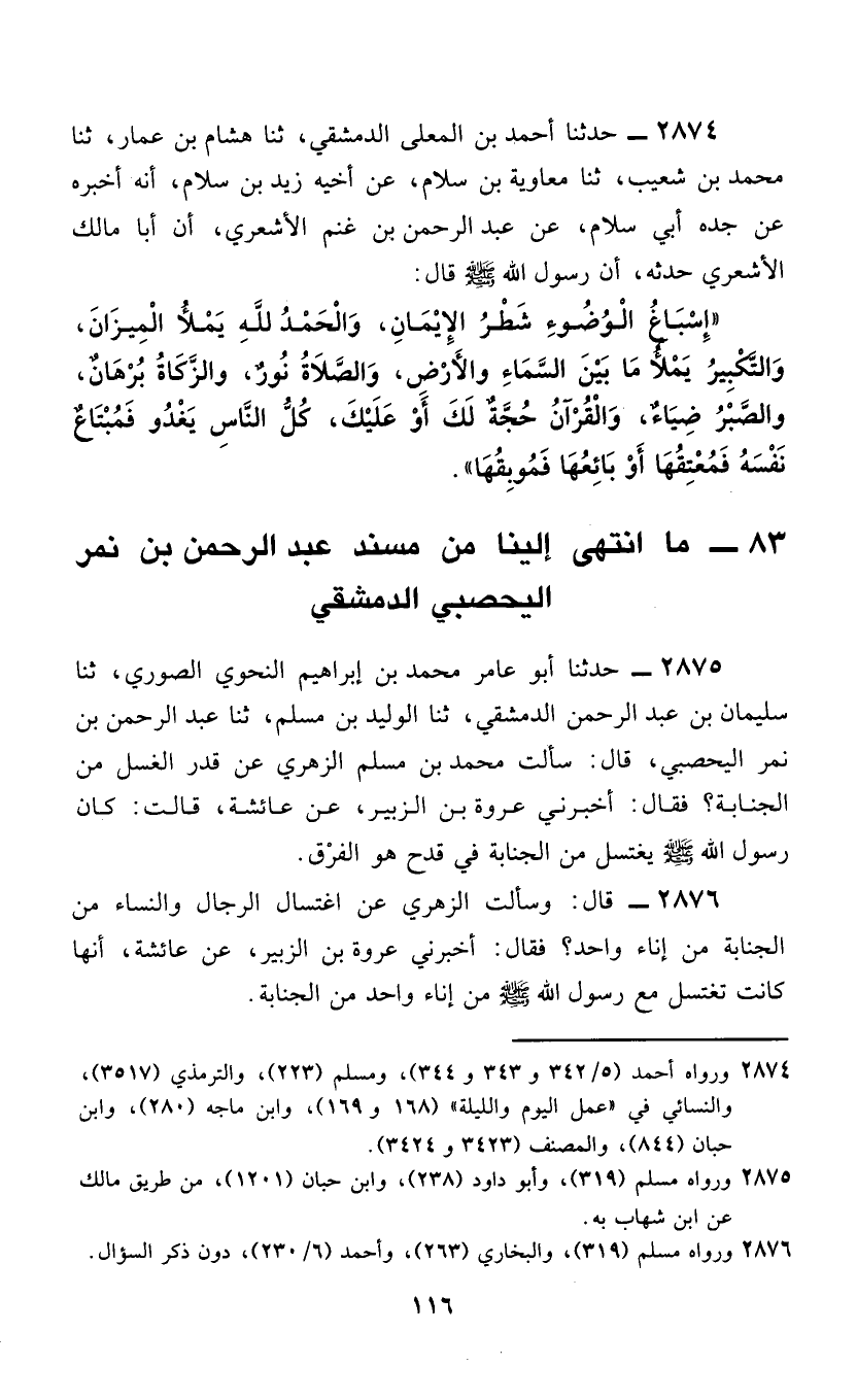 2874 - حَدَّثَنَا أَحْمَدُ بْنُ الْمُعَلَّى الدِّمَشْقِيُّ، ثَنَا هِشَامُ بْنُ عَمَّارٍ، ثَنَا مُحَمَّدُ بْنُ شُعَيْبٍ، ثَنَا مُعَاوِيَةُ بْنُ سَلَّامٍ، عَنْ أَخِيهِ، زَيْدِ بْنِ سَلَّامٍ، أَنَّهُ أَخْبَرَهُ عَنْ جَدِّهِ أَبِي سَلَّامٍ، عَنْ عَبْدِ الرَّحْمَنِ بْنِ غَنْمٍ الْأَشْعَرِيِّ، أَنَّ أَبَا مَالِكٍ الْأَشْعَرِيَّ، حَدَّثَهُ، أَنَّ رَسُولَ اللَّهِ صَلَّى اللهُ عَلَيْهِ وَسَلَّمَ قَالَ: «§إِسْبَاغُ الْوُضُوءِ شَطْرُ الْإِيمَانِ، وَالْحَمْدُ لِلَّهِ يَمْلَأُ الْمِيزَانَ، وَالتَّكْبِيرُ يَمْلَأُ مَا بَيْنَ السَّمَاءِ وَالْأَرْضِ، وَالصَّلَاةُ نُورٌ، وَالزَّكَاةُ بُرْهَانٌ، وَالصَّبْرُ ضِيَاءٌ، وَالْقُرْآنُ حَجَّةٌ لَكَ أَوْ عَلَيْكَ، كُلُّ النَّاسِ يَغْدُو فَمُبْتَاعٌ نَفْسَهُ فَمُعْتِقُهَا أَوْ بَائِعُهَا فَمُوبِقُهَا»