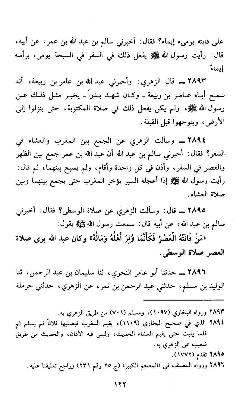 2895 - قَالَ: وَسَأَلْتُ الزُّهْرِيَّ عَنْ صَلَاةِ الْوُسْطَى،؟ فَقَالَ: أَخْبَرَنِي سَالِمُ بْنُ عَبْدِ اللَّهِ، عَنْ أَبِيهِ، قَالَ: سَمِعْتُ رَسُولَ اللَّهِ صَلَّى اللهُ عَلَيْهِ وَسَلَّمَ يَقُولُ: §«مَنْ فَاتَتْهُ الْعَصْرُ فَكَأَنَّمَا وُتِرَ أَهْلَهُ وَمَالَهُ» وَكَانَ عَبْدُ اللَّهِ يَرَى صَلَاةَ الْعَصْرِ صَلَاةَ الْوُسْطَى