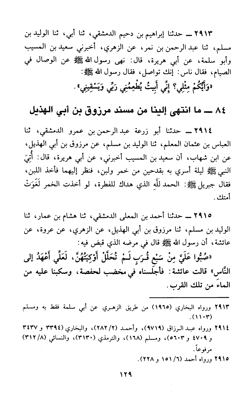 2913 - حَدَّثَنَا إِبْرَاهِيمُ بْنُ دُحَيْمٍ الدِّمَشْقِيُّ، ثَنَا أَبِي، ثَنَا الْوَلِيدُ بْنُ مُسْلِمٍ، ثَنَا عَبْدُ الرَّحْمَنِ بْنُ نَمِرٍ، عَنِ الزُّهْرِيِّ، أَخْبَرَنِي سَعِيدُ بْنُ الْمُسَيِّبِ، وَأَبُو سَلَمَةَ، عَنْ أَبِي هُرَيْرَةَ، قَالَ: نَهَى رَسُولُ اللَّهِ صَلَّى اللهُ عَلَيْهِ وَسَلَّمَ عَنِ الْوِصَالِ فِي الصِّيَامِ، فَقَالَ نَاسٌ: إِنَّكَ تُوَاصِلُ، فَقَالَ رَسُولُ اللَّهِ صَلَّى اللهُ عَلَيْهِ وَسَلَّمَ: §«وَأَيُّكُمْ مِثْلِي؟ إِنِّي أَبِيتُ يُطْعِمُنِي رَبِّي وَيَسْقِينِي»
