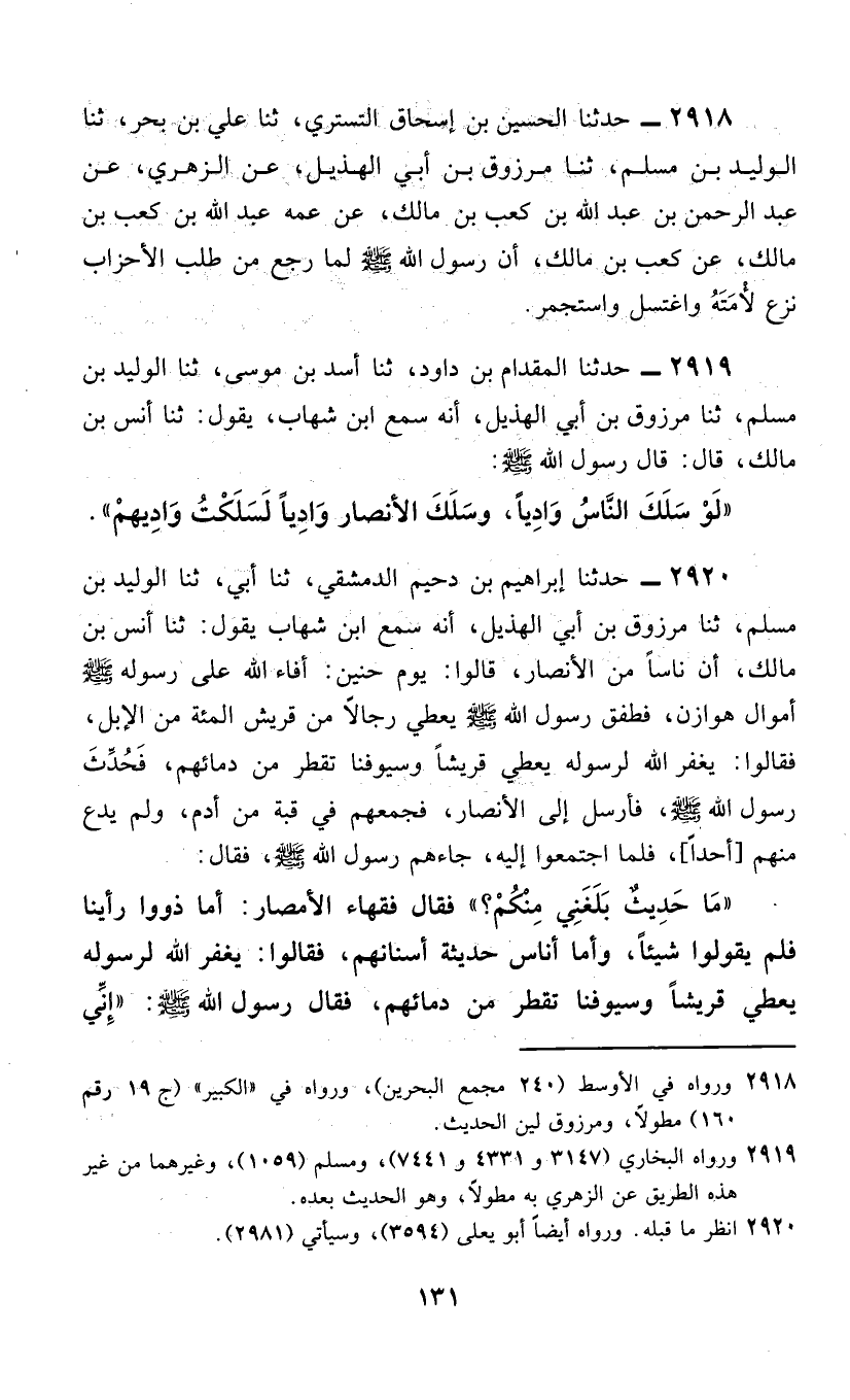 2919 - حَدَّثَنَا الْمِقْدَامُ بْنُ دَاوُدَ، ثَنَا أَسَدُ بْنُ مُوسَى، ثَنَا الْوَلِيدُ بْنُ مُسْلِمٍ، ثَنَا مَرْزُوقُ بْنُ أَبِي الْهُذَيْلِ، أَنَّهُ سَمِعَ ابْنَ شِهَابٍ، يَقُولُ: ثَنَا أَنَسُ بْنُ مَالِكٍ، قَالَ: قَالَ رَسُولُ اللَّهِ صَلَّى اللهُ عَلَيْهِ وَسَلَّمَ: §«لَوْ سَلَكَ النَّاسُ وَادِيًا، وَسَلَكَ الْأَنْصَارُ وَادِيًا لَسَلَكْتُ وَادِيَهُمْ»