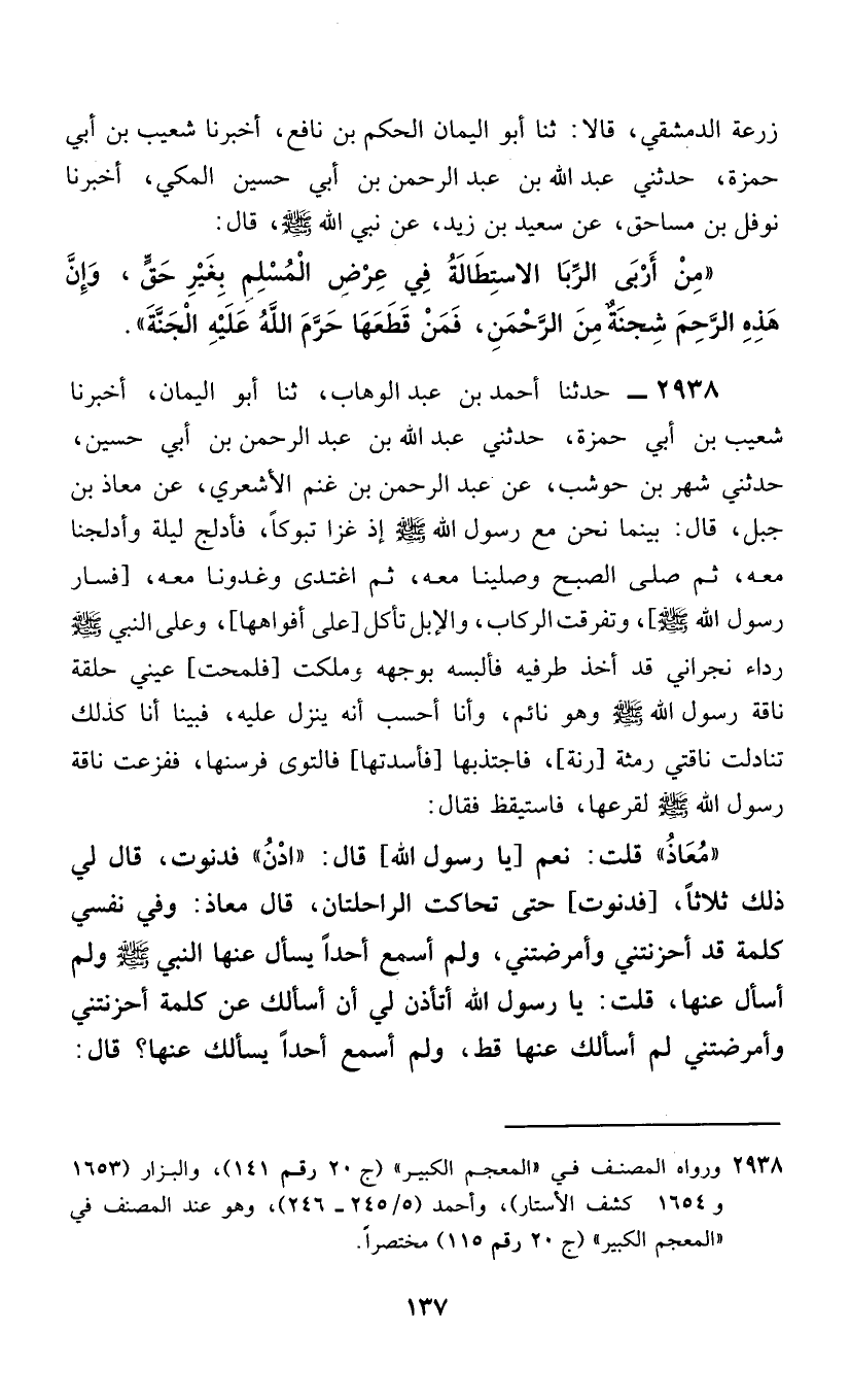 2938 - حَدَّثَنَا أَحْمَدُ بْنُ عَبْدِ الْوَهَّابِ، ثَنَا أَبُو الْيَمَانِ، أَخْبَرَنَا شُعَيْبُ بْنُ أَبِي حَمْزَةَ، حَدَّثَنِي عَبْدُ اللَّهِ بْنُ عَبْدِ الرَّحْمَنِ بْنِ أَبِي حُسَيْنٍ، حَدَّثَنِي شَهْرُ بْنُ حَوْشَبٍ، عَنْ عَبْدِ الرَّحْمَنِ بْنِ غَنْمٍ الْأَشْعَرِيِّ، عَنْ مُعَاذِ بْنِ جَبَلٍ، قَالَ: بَيْنَمَا نَحْنُ مَعَ رَسُولِ اللَّهِ صَلَّى اللهُ عَلَيْهِ وَسَلَّمَ إِذْ غَزَا تَبُوكًا، فَأَدْلَجَ لَيْلَةً وَأَدْلَجْنَا مَعَهُ، ثُمَّ صَلَّى الصُّبْحَ وَصَلَّيْنَا مَعَهُ، ثُمَّ اغْتَدَى وَغَدَوْنَا مَعَهُ، [فَسَارَ رَسُولُ اللَّهِ صَلَّى اللهُ عَلَيْهِ وَسَلَّمَ] ، وَتَفَرَّقَتِ الرِّكَابُ، وَالْإِبِلُ تَأْكُلُ [عَلَى أَفْوَاهِهَا] ، وَعَلَى النَّبِيِّ صَلَّى اللهُ عَلَيْهِ وَسَلَّمَ رِدَاءٌ نَجْرَانِيٌّ قَدْ أَخَذَ طَرَفَيْهِ فَأَلْبَسَهُ بِوَجْهِهِ وَمَلَكَتْ [فَلَمَحَتْ] عَيْنِي حَلْقَةَ نَاقَةِ رَسُولِ اللَّهِ صَلَّى اللهُ عَلَيْهِ وَسَلَّمَ وَهُوَ نَائِمٌ، وَأَنَا أَحْسِبُ أَنَّهُ يَنْزِلُ عَلَيْهِ، فَبَيْنَا أَنَا كَذَلِكَ تَنَادَلَتْ نَاقَتِي رِمْثَةً [رَنَّةً] ؛ فَاجْتَذَبَهَا [فَأَسْدَتُّهَا] ؛ فَالْتَوَى فَرَسَنَهَا، فَفَزِعَتْ نَاقَةُ رَسُولِ اللَّهِ صَلَّى اللهُ عَلَيْهِ وَسَلَّمَ لِقَرْعِهَا، فَاسْتَيْقَظَ، فَقَالَ: «مُعَاذُ» قُلْتُ: نَعَمْ [يَا رَسُولَ اللَّهِ] ، قَالَ: «ادْنُ» فَدَنَوْتُ، قَالَ لِي ذَلِكَ ثَلَاثًا، [فَدَنَوْتُ] حَتَّى تَحَاكَتِ الرَّاحِلَتَانِ، قَالَ مُعَاذُ: وَفِي نَفْسِي كَلِمَةٌ قَدْ أَحْزَنَتْنِي وَأَمْرَضَتْنِي، وَلَمْ أَسْمَعْ أَحَدًا يَسْأَلُ عَنْهَا النَّبِيَّ صَلَّى اللهُ عَلَيْهِ وَسَلَّمَ، وَلَمْ أَسْأَلْ عَنْهَا، قُلْتُ: يَا رَسُولَ اللَّهِ أَتَأْذَنُ لِي أَنْ أَسْأَلَكَ عَنْ كَلِمَةٍ أَحْزَنَتْنِي وَأَمْرَضَتْنِي لَمْ أَسْأَلْكَ عَنْهَا قَطُّ، وَلَمْ أَسْمَعْ أَحَدًا يَسْأَلُكَ عَنْهَا؟ قَالَ -[138]-: «سَلْ يَا مُعَاذُ» قُلْتُ: حَدِّثْنِي عَنْ عَمِلٍ يُدْخِلُنِي الْجَنَّةَ لَا أَسْأَلُكَ عَنْ غَيْرِهِ، فَقَالَ: «بَخٍ بَخٍ، §لَقَدْ سَأَلْتَ عَنْ عَظِيمٍ، وَإِنَّهُ لَيَسِيرٌ عَلَى مِنْ يَسُرَّهُ اللَّهُ؛ تَشَهَّدُ أَنْ لَا إِلَهَ إِلَّا اللَّهُ، وَأَنَّ مُحَمَّدًا رَسُولُ اللَّهِ، وَتُقِيمُ الصَّلَاةِ، وَتُؤَدِّي الزَّكَاةَ، وَتَعَبَّدُ اللَّهَ وَحْدَهُ» ثُمَّ أَقْبَلْتُ عَلَيْهِ أَسْأَلُهُ، فَقُلْتُ: أَيُّ الْأَعْمَالِ أَفْضَلُ، الصَّلَاةُ بَعْدَ الصَّلَاةِ الْمَفْرُوضَةِ؟ قَالَ: «لَا، وَنِعْمَ مَا هِيَ» ، قُلْتُ: الزَّكَاةُ بَعْدَ الزَّكَاةِ [الْمَفْرُوضَةِ] ؟ قَالَ: «لَا، وَنِعْمَ مَا هِيَ» قُلْتُ: فَالصِّيَامُ بَعْدَ الصِّيَامِ [الْمَفْرُوضِ] ؟ قَالَ: «لَا، وَنِعْمَ مَا هِيَ» ثُمَّ قَالَ: «يَا مُعَاذُ، أَلَا أُخْبِرُكَ بِرَأْسِ هَذَا الْأَمْرِ وَقَوَامِهِ وَذُرْوَةِ سَنَامِهِ؟» فَقُلْتُ: بَلَى، قَالَ: «رَأْسُ هَذَا الْأَمْرِ شَهَادَةُ أَنَّ لَا إِلَهَ إِلَّا اللَّهُ، وَأَنَّ مُحَمَّدًا عَبْدُهُ وَرَسُولُهُ، وَقِوَامُهُ إِقَامَةُ الصَّلَاةِ وَإِيتَاءِ الزَّكَاةِ، وَذُرْوَةُ سَنَامِهِ الْجِهَادُ فِي سَبِيلِ اللَّهِ، وَالَّذِي نَفْسُ مُحَمَّدٍ بِيَدِهِ مَا تَغَبَّرَتْ قَدَمَا عَبْدٍ وَلَا وَجْهُهُ فِي عَمِلٍ أَفْضَلَ عِنْدَ اللَّهِ بَعْدَ الصَّلَاةِ الْمَفْرُوضَةِ مِنْ جِهَادِ فِي سَبِيلِهِ، أَلَا أُخْبِرُكَ يَا مُعَاذُ بِأَمْلَكَ بِالنَّاسِ مِنْ ذَلِكَ؟» قُلْتُ: نَعَمْ، فَوَضَعَ إِصْبَعَهُ عَلَى لِسَانِهِ. فَقُلْتُ: يَا رَسُولَ اللَّهِ أَوَ كُلَّمَا نَقُولُ بِأَلْسِنَتِنَا يُكْتَبُ عَلَيْنَا؟ فَضَرَبَ مَنْكِبِي الْأَيْسَرَ بِيَدِهِ الْيُمْنَى حَتَّى أَوْجَعَنِي ثُمَّ قَالَ: «ثَكِلَتْكَ أُمُّكَ يَا مُعَاذُ