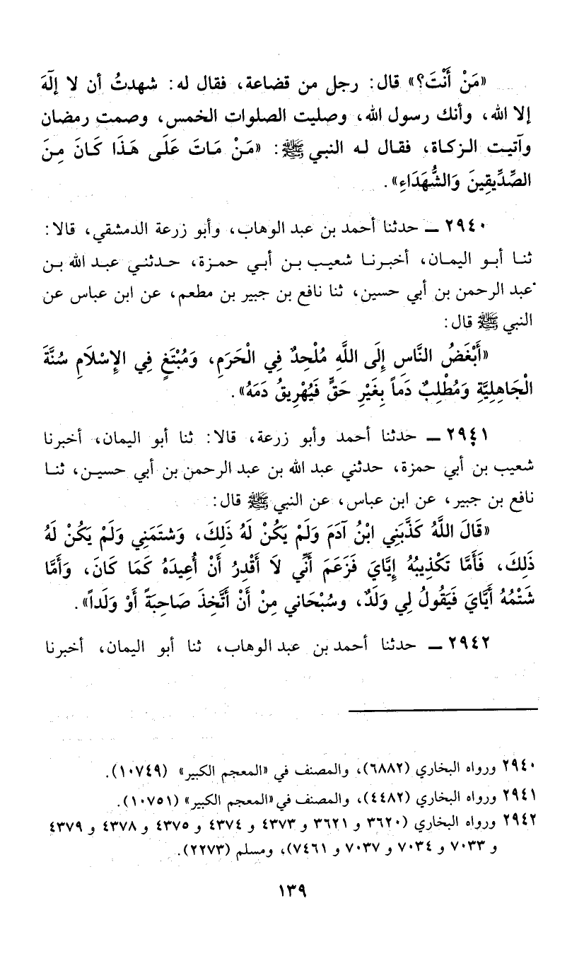 2940 - حَدَّثَنَا أَحْمَدُ بْنُ عَبْدِ الْوَهَّابِ، وَأَبُو زُرْعَةَ الدِّمَشْقِيُّ، قَالَا: ثَنَا أَبُو الْيَمَانِ، أَخْبَرَنَا شُعَيْبُ بْنُ أَبِي حَمْزَةَ، حَدَّثَنِي عَبْدُ اللَّهِ بْنُ عَبْدِ الرَّحْمَنِ بْنِ أَبِي حُسَيْنٍ، ثَنَا نَافِعُ بْنُ جُبَيْرِ بْنِ مُطْعِمٍ، عَنِ ابْنِ عَبَّاسِ، عَنِ النَّبِيِّ صَلَّى اللهُ عَلَيْهِ وَسَلَّمَ قَالَ: «§أَبْغَضُ النَّاسِ إِلَى اللَّهِ مُلْحِدٌ فِي الْحَرَمِ، وَمُبْتَغٍ فِي الْإِسْلَامِ سُنَّةَ الْجَاهِلِيَّةِ، وَمُطْلِبٌ دَمًا بِغَيْرِ حَقٍّ فَيُهَرِيقُ دَمَهُ»