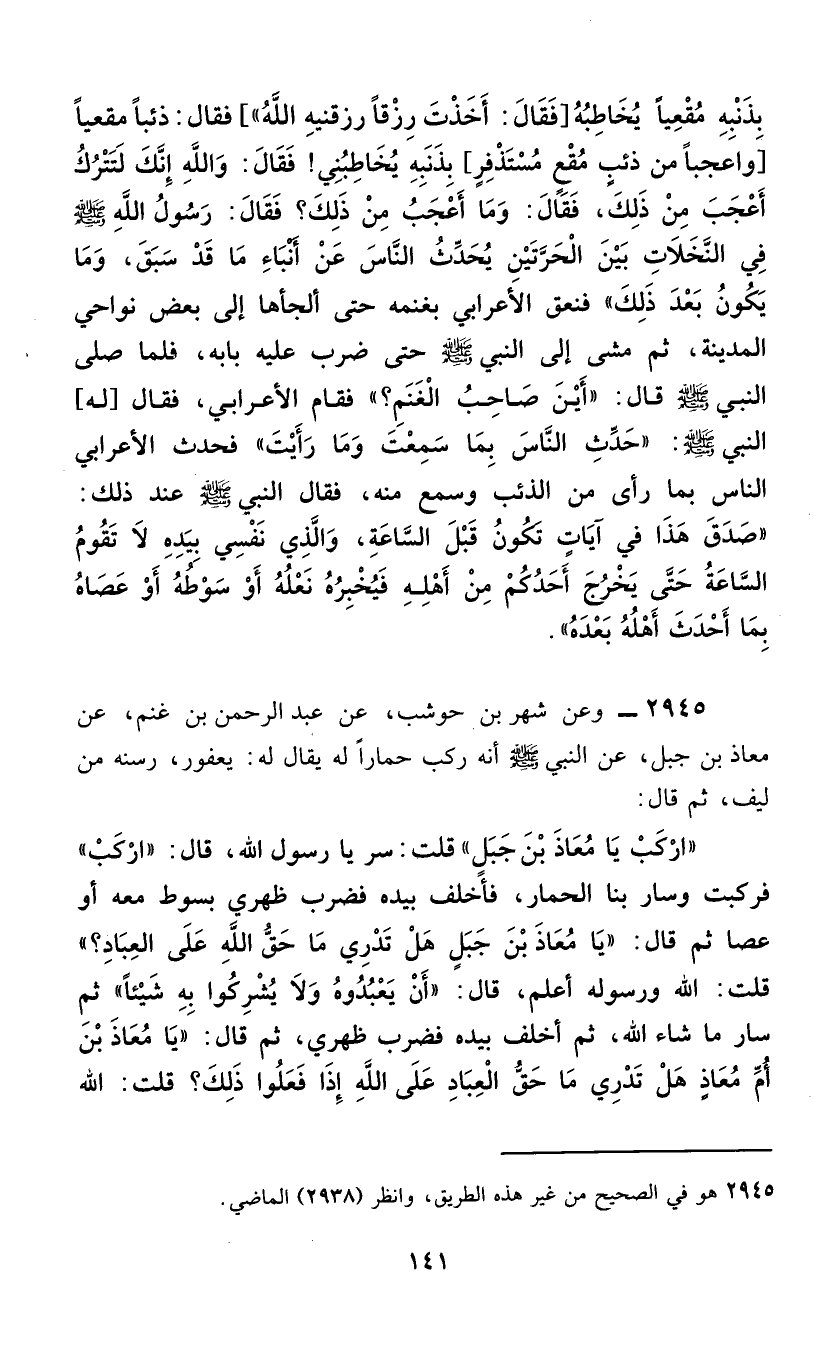 2945 - وَعَنْ شَهْرِ بْنِ حَوْشَبٍ، عَنْ عَبْدِ الرَّحْمَنِ بْنِ غَنْمٍ، عَنْ مُعَاذِ بْنِ جَبَلٍ، عَنِ النَّبِيِّ صَلَّى اللهُ عَلَيْهِ وَسَلَّمَ أَنَّهُ رَكِبَ حِمَارًا لَهُ يُقَالُ لَهُ: يَعْفُورُ، رَسَنُهُ مِنْ لِيفٍ، ثُمَّ قَالَ: «ارْكَبْ يَا مُعَاذُ بْنُ جَبَلٍ» قُلْتُ: سِرْ يَا رَسُولَ اللَّهِ، قَالَ: «ارْكَبْ» ؛ فَرَكِبْتُ وَسَارَ بِنَا الْحِمَارُ، فَأَخْلَفَ بِيَدِهِ فَضَرَبَ ظَهْرِي بِسَوْطٍ مَعَهُ أَوْ عَصًا، ثُمَّ قَالَ: " يَا مُعَاذُ بْنَ جَبَلٍ، §هَلْ تَدْرِي مَا حَقُّ اللَّهِ عَلَى الْعِبَادِ؟ قُلْتُ: اللَّهُ وَرَسُولُهُ أَعْلَمُ، قَالَ: «أَنْ يَعْبُدُوهُ وَلَا يُشْرِكُوا بِهِ شَيْئًا» ثُمَّ سَارَ مَا شَاءَ اللَّهُ، ثُمَّ أَخْلَفَ بِيَدِهِ فَضَرَبَ ظَهْرِي، ثُمَّ قَالَ: " يَا مُعَاذُ بْنَ أُمِّ مُعَاذٍ، هَلْ تَدْرِي مَا حَقُّ الْعِبَادِ عَلَى اللَّهِ إِذَا فَعَلُوا ذَلِكَ؟ قُلْتُ: اللَّهُ -[142]- وَرَسُولُهُ أَعْلَمُ. قَالَ: «فَإِنَّ حَقَّ الْعِبَادِ عَلَى اللَّهِ إِذَا فَعَلُوا ذَلِكَ أَنْ يُدْخِلَهُمُ الْجَنَّةَ»