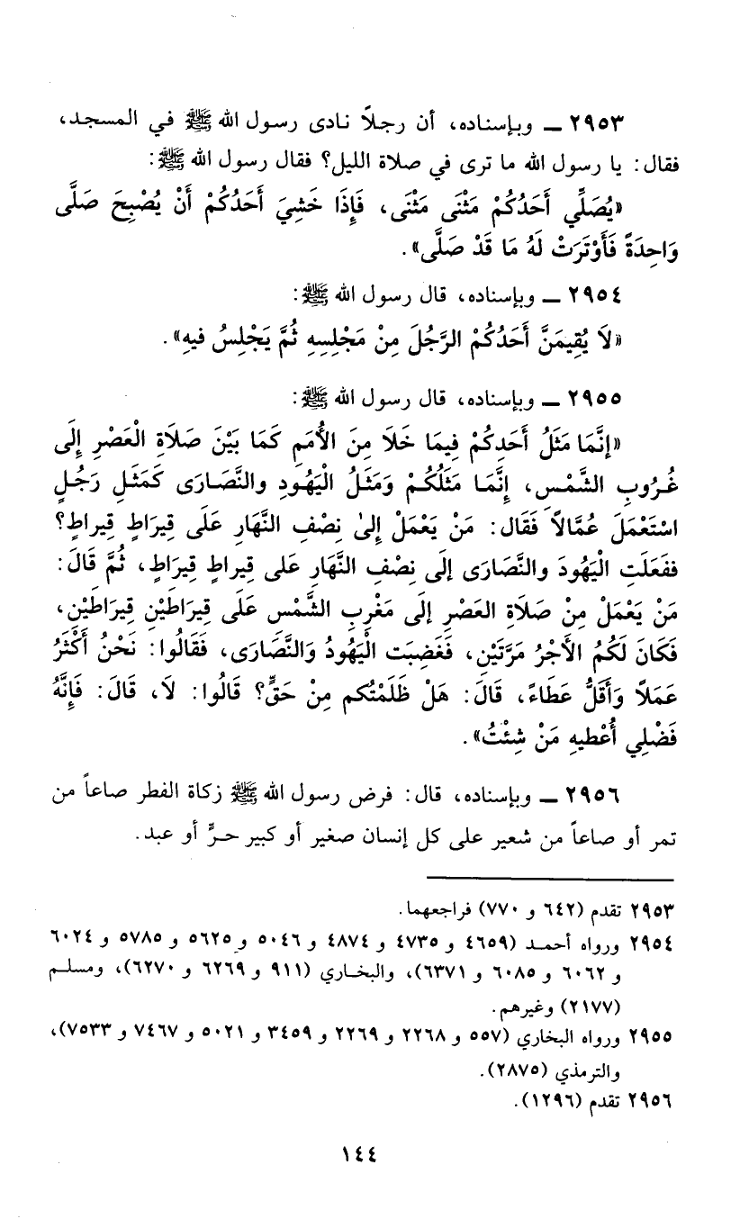 2956 - وَبِإِسْنَادِهِ، قَالَ: §فَرَضَ رَسُولُ اللَّهِ صَلَّى اللهُ عَلَيْهِ وَسَلَّمَ زَكَاةَ الْفِطْرِ صَاعًا مِنْ تَمْرٍ أَوْ صَاعًا مِنْ شَعِيرٍ عَلَى كُلِّ إِنْسَانٍ صَغِيرٍ أَوْ كَبِيرٍ حُرٍّ أَوْ عَبْدٍ -[145]-. قَالَ عَبْدُ اللَّهِ بْنُ عُمَرَ: فَجَعَلَ النَّاسُ بِمِثْلِ ذَلِكَ مُدَّيْنِ مِنْ حِنْطَةَ