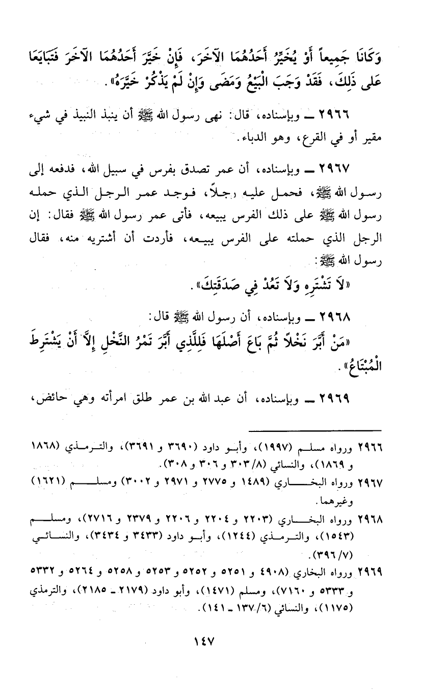 2967 - وَبِإِسْنَادِهِ، أَنَّ عُمَرَ تَصَدَّقَ بِفَرَسٍ فِي سَبِيلِ اللَّهِ، فَدَفَعَهُ إِلَى رَسُولِ اللَّهِ صَلَّى اللهُ عَلَيْهِ وَسَلَّمَ، فَحَمَلَ عَلَيْهِ رَجُلًا، فَوَجَدَ عُمَرُ الرَّجُلَ الَّذِي حَمَلَهُ رَسُولُ اللَّهِ صَلَّى اللهُ عَلَيْهِ وَسَلَّمَ عَلَى ذَلِكَ الْفَرَسِ يَبِيعَهُ، فَأَتَى عُمَرُ رَسُولَ اللَّهِ صَلَّى اللهُ عَلَيْهِ وَسَلَّمَ فَقَالَ: إِنَّ الرَّجُلَ الَّذِي حَمَلْتَهُ عَلَى الْفَرَسِ يَبِيعُهُ، فَأَرَدْتُ أَنْ أَشْتَرِيَهُ مِنْهُ، فَقَالَ رَسُولُ اللَّهِ صَلَّى اللهُ عَلَيْهِ وَسَلَّمَ: §«لَا تَشْتَرِهِ وَلَا تَعُدْ فِي صَدَقَتِكَ»