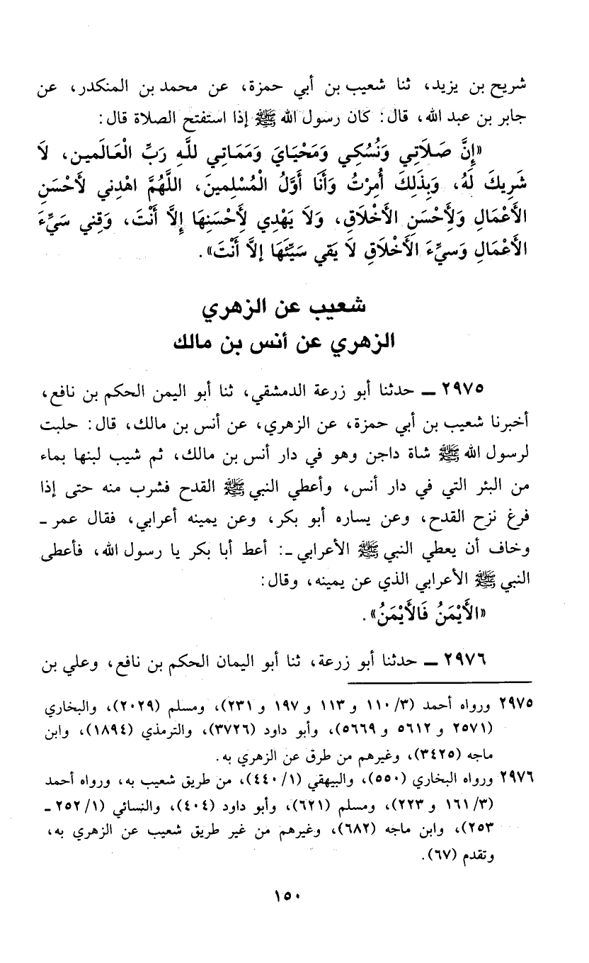 2975 - حَدَّثَنَا أَبُو زُرْعَةَ الدِّمَشْقِيُّ، ثَنَا أَبُو الْيَمَانِ الْحَكَمُ بْنُ نَافِعٍ، أَخْبَرَنَا شُعَيْبُ بْنُ أَبِي حَمْزَةَ، عَنِ الزُّهْرِيِّ، عَنْ أَنَسِ بْنِ مَالِكٍ، قَالَ: حَلَبْتُ لِرَسُولِ اللَّهِ صَلَّى اللهُ عَلَيْهِ وَسَلَّمَ شَاةً دَاجِنَ وَهُوَ فِي دَارِ أَنَسِ بْنِ مَالِكٍ، ثُمَّ شِيبَ لَبَنُهَا بِمَاءٍ مِنَ الْبِئْرِ الَّتِي فِي دَارِ أَنَسٍ، وَأُعْطِيَ النَّبِيُّ صَلَّى اللهُ عَلَيْهِ وَسَلَّمَ الْقَدَحَ؛ فَشَرِبَ مِنْهُ حَتَّى إِذَا فَرَغَ، نَزَحَ الْقَدَحَ، وَعَنْ يَسَارِهِ أَبُو بَكْرٍ، وَعَنْ يَمِينِهِ أَعْرَابِيٌّ، فَقَالَ عُمَرُ - وَخَافَ أَنْ يُعْطِيَ النَّبِيَّ صَلَّى اللهُ عَلَيْهِ وَسَلَّمَ الْأَعْرَابِيُّ: أَعْطِ أَبَا بَكْرٍ يَا رَسُولَ اللَّهِ، فَأَعْطَى النَّبِيُّ صَلَّى اللهُ عَلَيْهِ وَسَلَّمَ الْأَعْرَابِيَّ الَّذِي عَنْ يَمِينِهِ، وَقَالَ: §«الْأَيْمَنُ فَالْأَيْمَنُ»