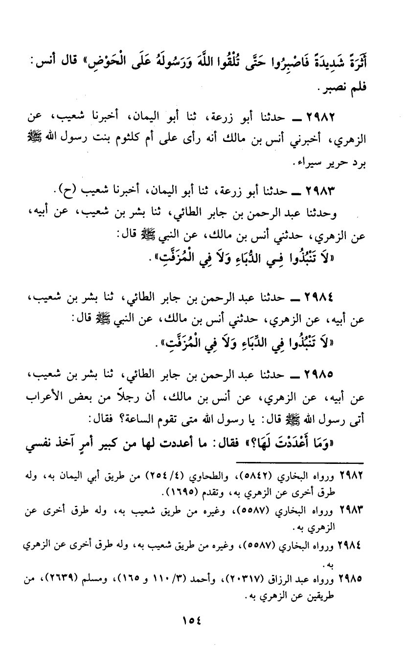 2984 - حَدَّثَنَا عَبْدُ الرَّحْمَنِ بْنُ جَابِرٍ الطَّائِيُّ، ثَنَا بِشْرُ بْنُ شُعَيْبٍ، عَنْ أَبِيهِ، عَنِ الزُّهْرِيِّ، حَدَّثَنِي أَنَسُ بْنُ مَالِكٍ، عَنِ النَّبِيِّ صَلَّى اللهُ عَلَيْهِ وَسَلَّمَ قَالَ: §«لَا تَنْبِذُوا فِي الدُّبَّاءِ وَلَا فِي الْمُزَفَّتِ»